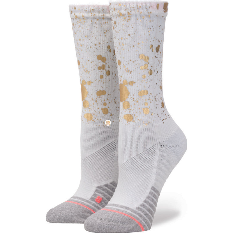 Exercising releases endorphins and those endorphins make you happy. Happy people wear Stance’s White Endorphin Women's Socks. These training socks were inspired by the Uncommon athlete. The socks have a 80/20 fiber blend that has sweat-wicking properties for advanced moisture management. For added breathability there are strategically placed mesh panels. Featuring anatomical cushioning and a seamless toe closure so nothing gets in the way of your training. Stance did not spare a thing when it comes to design, the cool gold paint splatter design is sure to stand out.