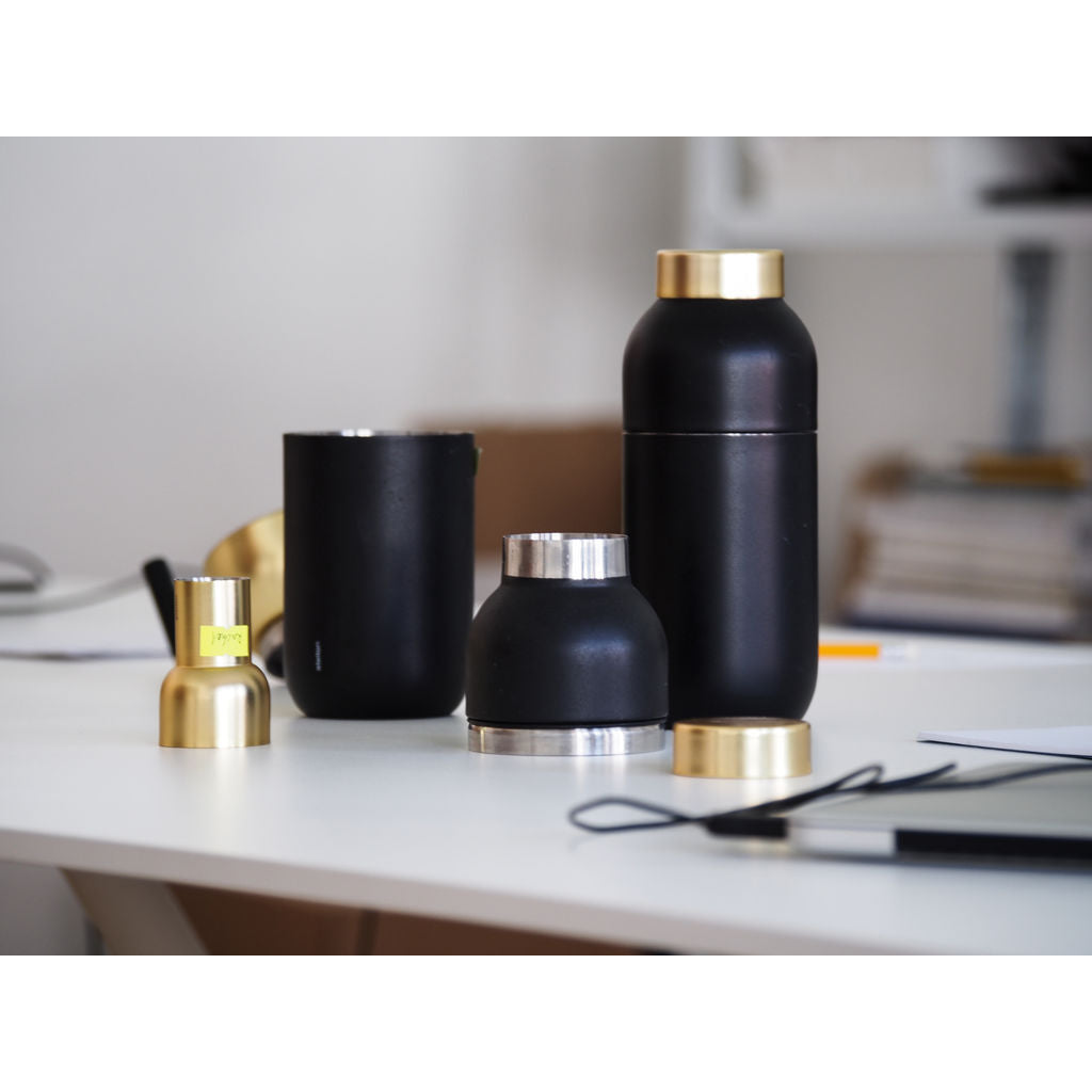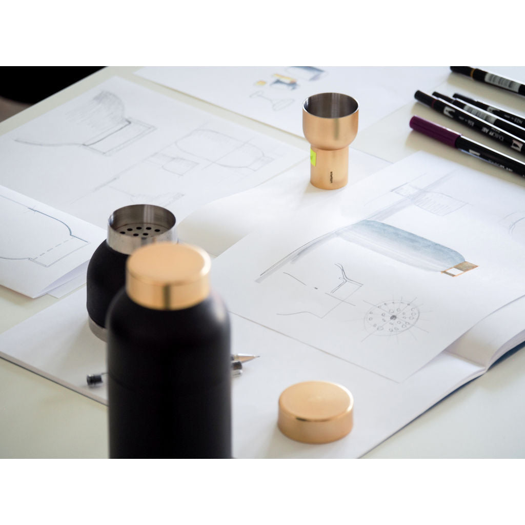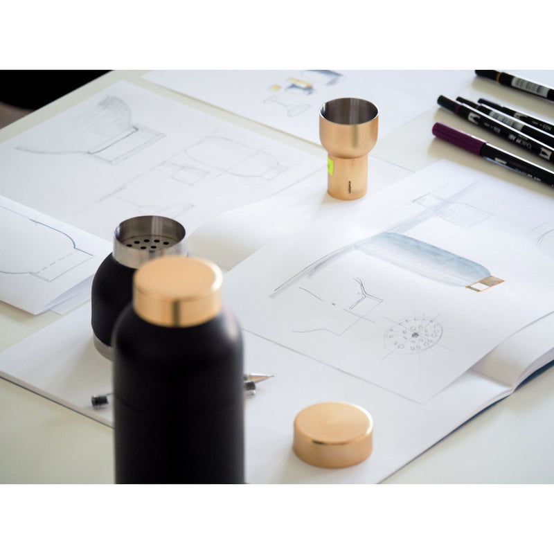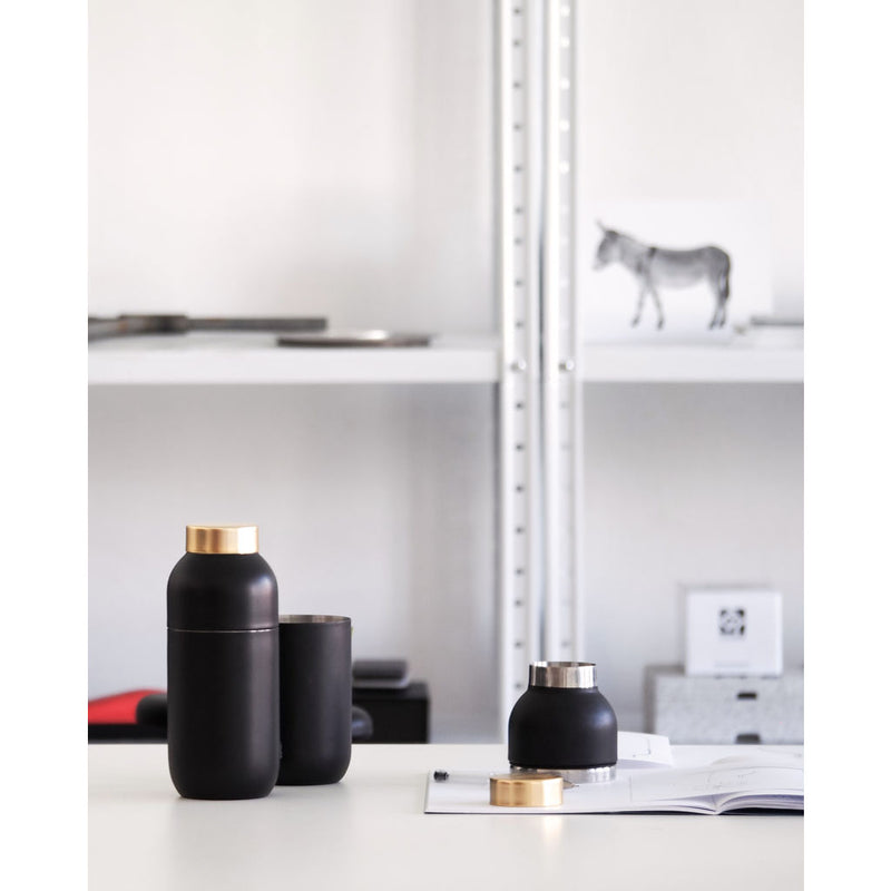 Adding to the already luxurious collar collection, the Steel Cocktail Shaker and Measuring Cup capture a uniquely dark and rigid silhouette. With a 500 ml capacity, this shaker is a small space solution to crafting delicious mixed drinks right at home. While the body of the Collar Cocktail Shaker uses the same matte black finish common throughout the collection, the lid and measuring cup both feature an elegant brass veneer.