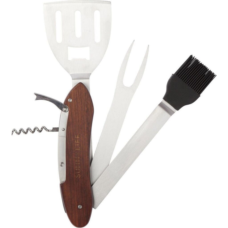 - Multi functional tool includes a spatula, fork, marinade brush, bottle opener, and corkscrew.