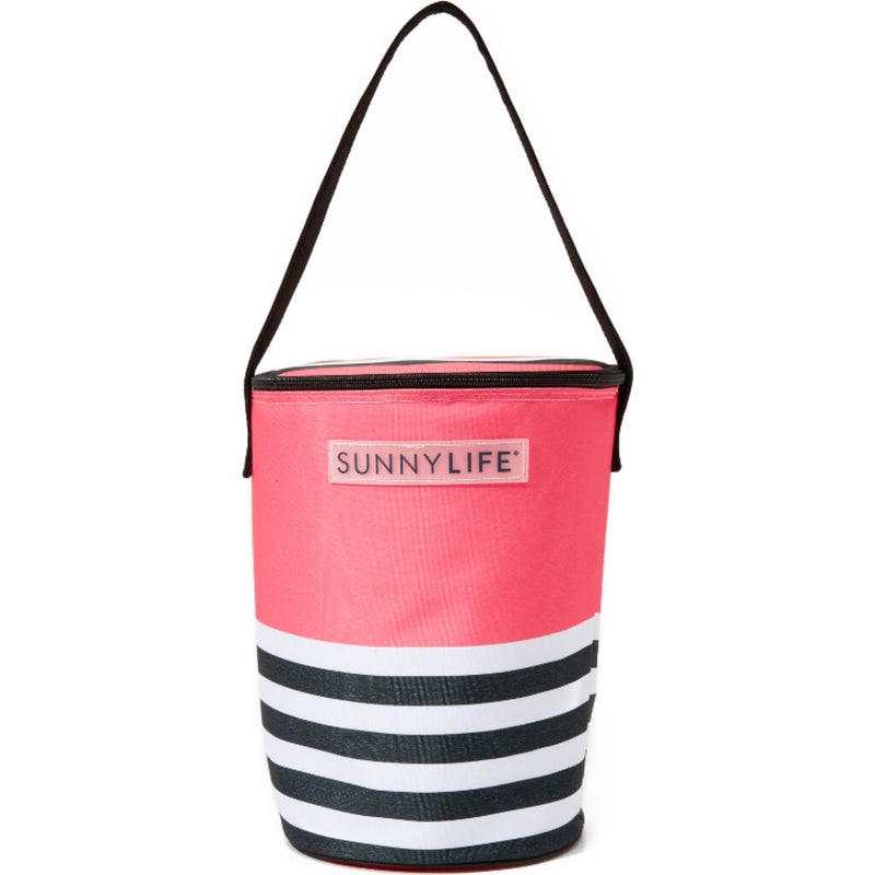 A cylindrical SunnyLife cooler bag in a bold pattern. The wraparound zip opens to the insulated, aluminum-lined interior. Wide handle.