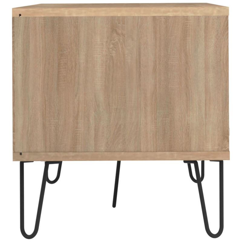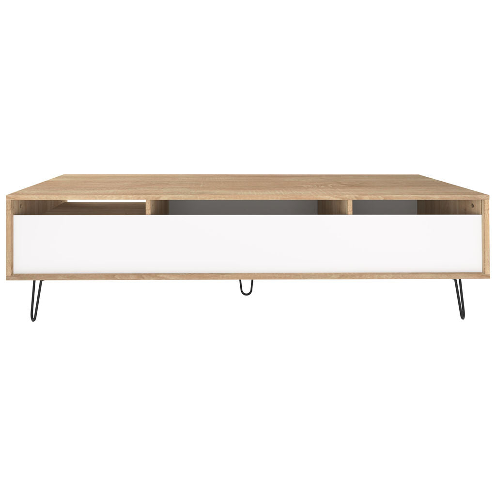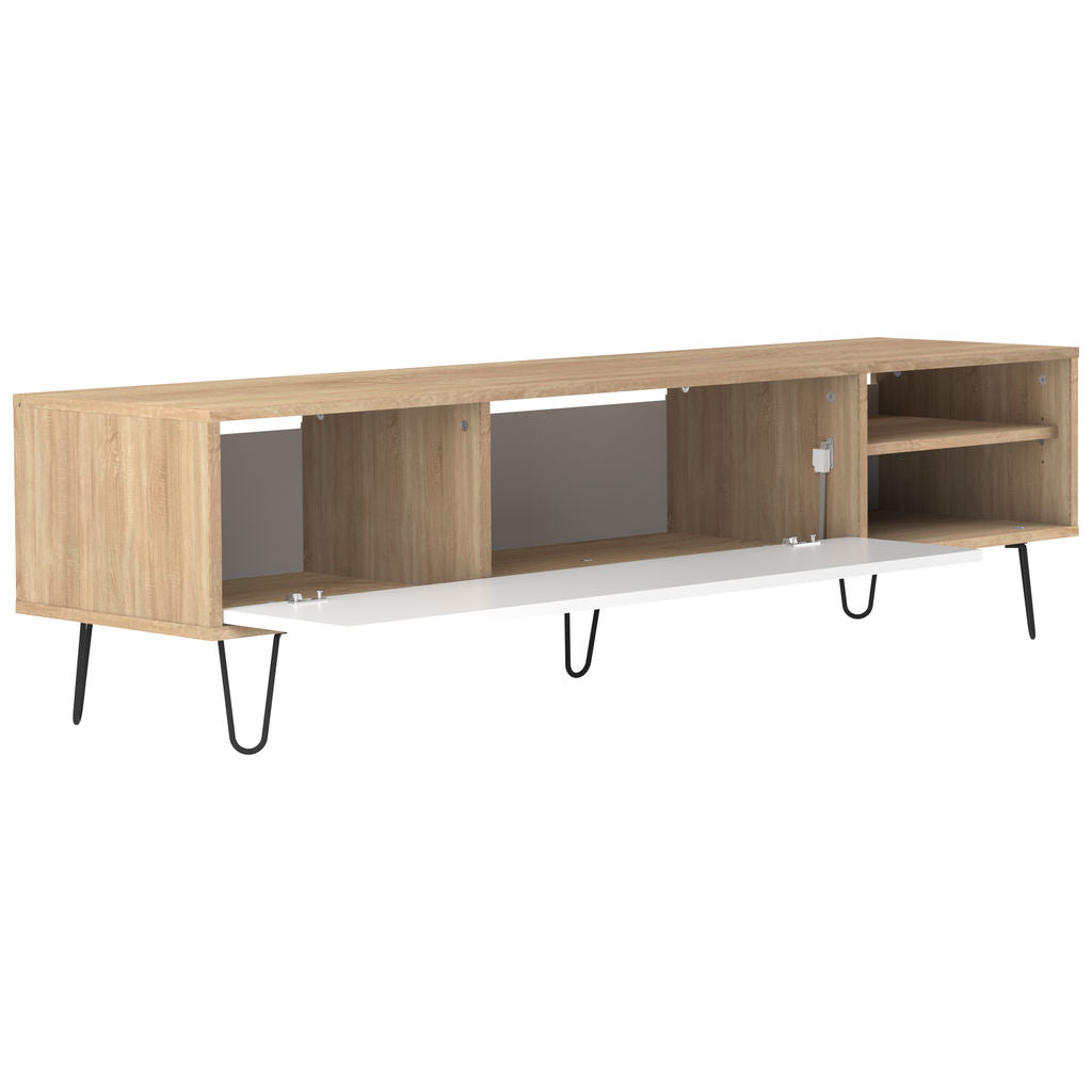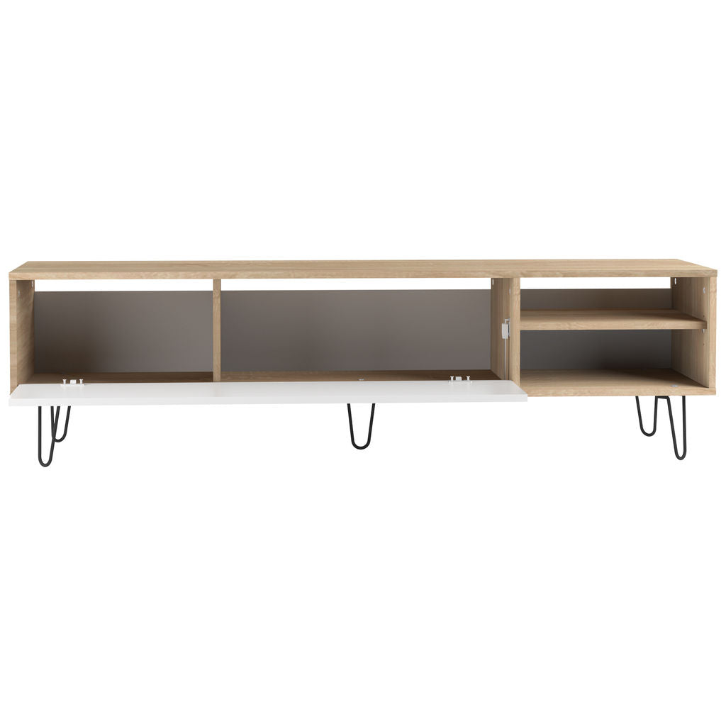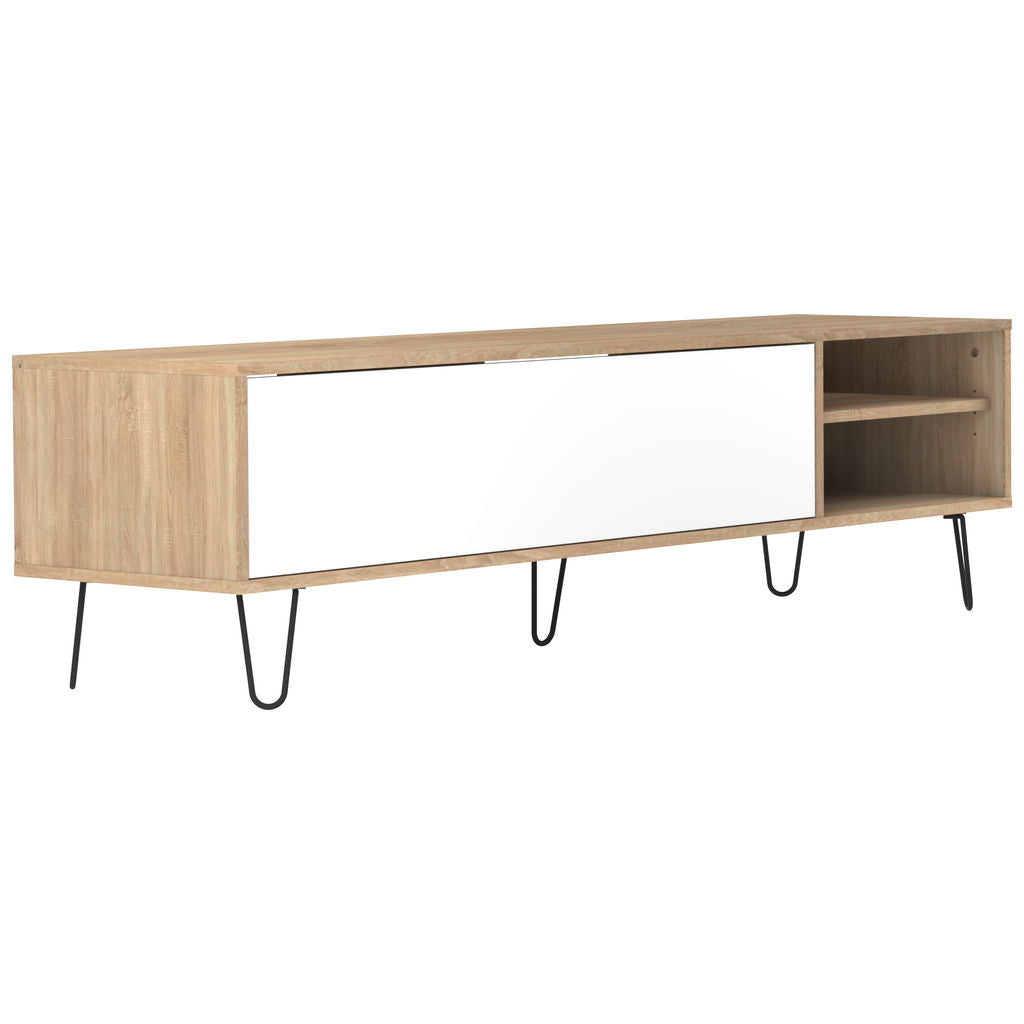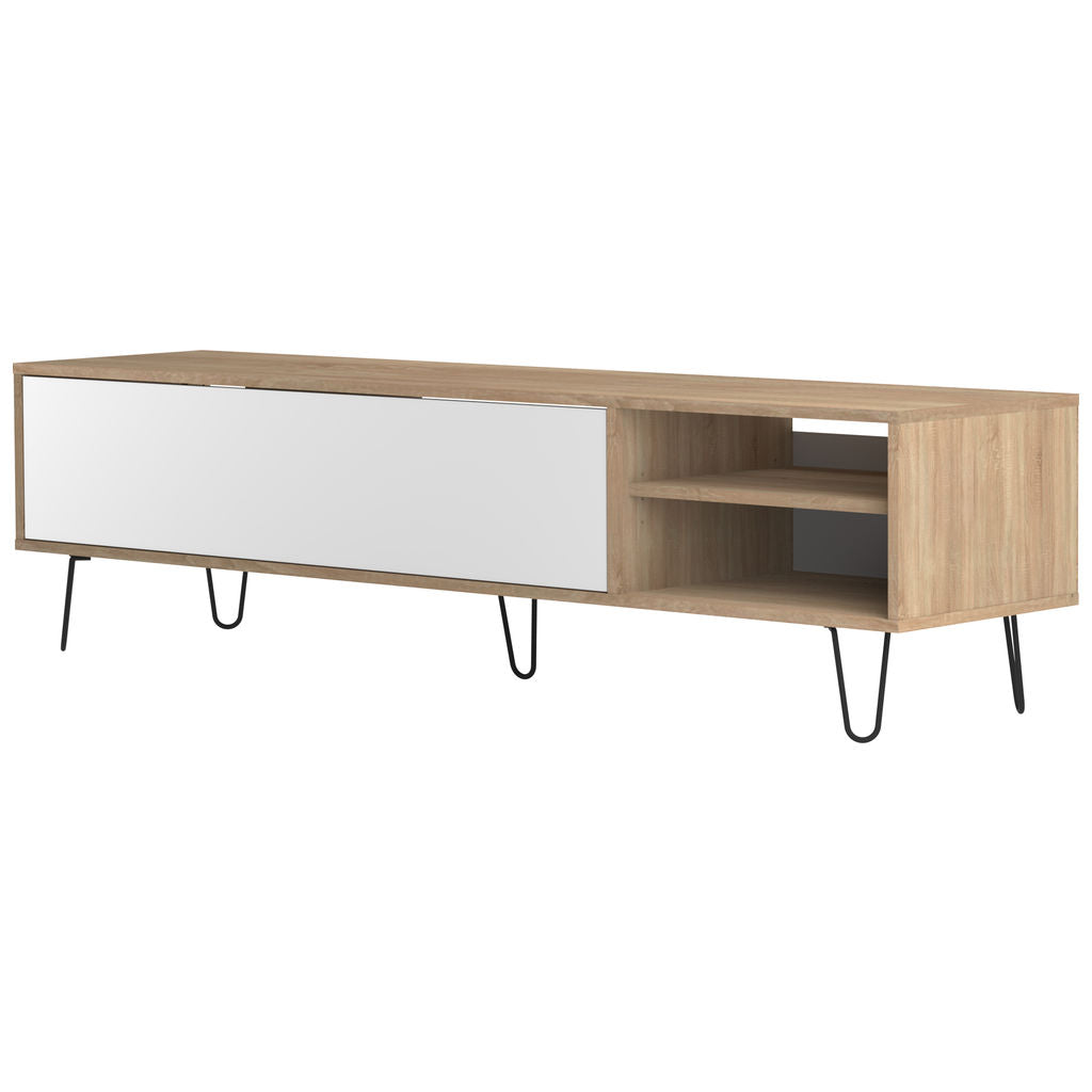 Complete the look of your living room with the Natural Oak and White Aero TV Stand from Symbiosis. This vintage style storage cabinet has one large drop down drawer and two shelves to keep all your equipment organized. There are holes in the back of the cabinet that allow you to keep all your cords neat. Featuring a Natural Oak printed frame & shelf, painted white door, and metal wire legs that have been lacquered a charcoal grey color. Symbiosis furniture is made in France, Eco- Friendly and shipped flat packed.