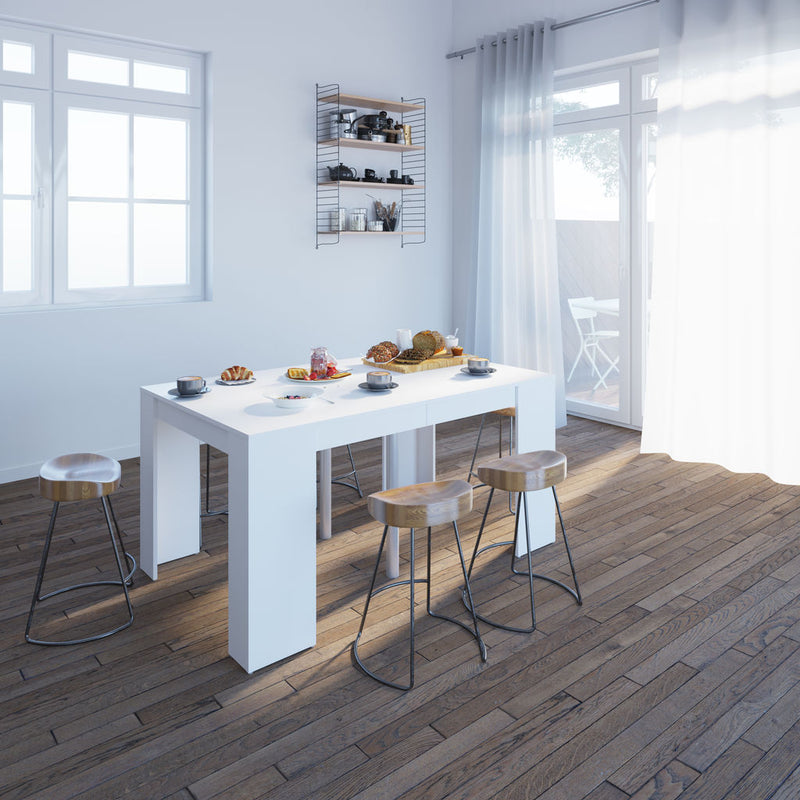 The White Elastic Expandable Dining and Console Table from Symbiosis can adjust to your needs day to day. This table can change from 39, 58, or 78 inches long. Painted with a matte white color, this table will match any design. Use in your dining room and be prepared for any size dinner party. There are 3 extensions that can be used. Made with aluminum glides, a system for blocking and aligning the extensions, and removable middle support legs. Symbiosis furniture is made in France, Eco- Friendly and shipped flat packed.