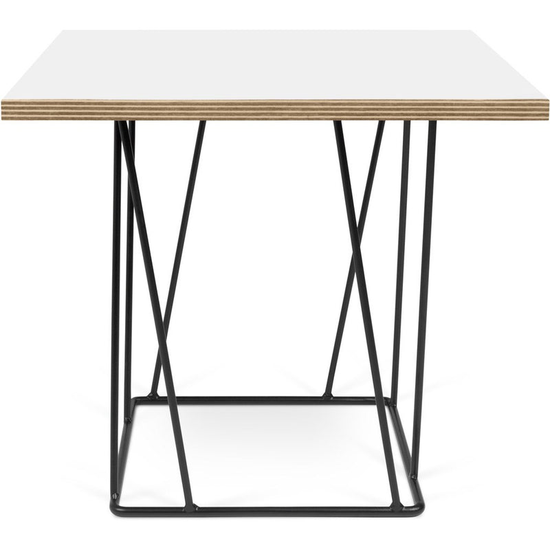 The Helix Marble Side Table features a unique design with a white and plywood tabletop and a metallic base constructed from crossing metal rods. ��The combination of wood��and metal provides for a strikingly modern aesthetic that is sure to complement any space.��