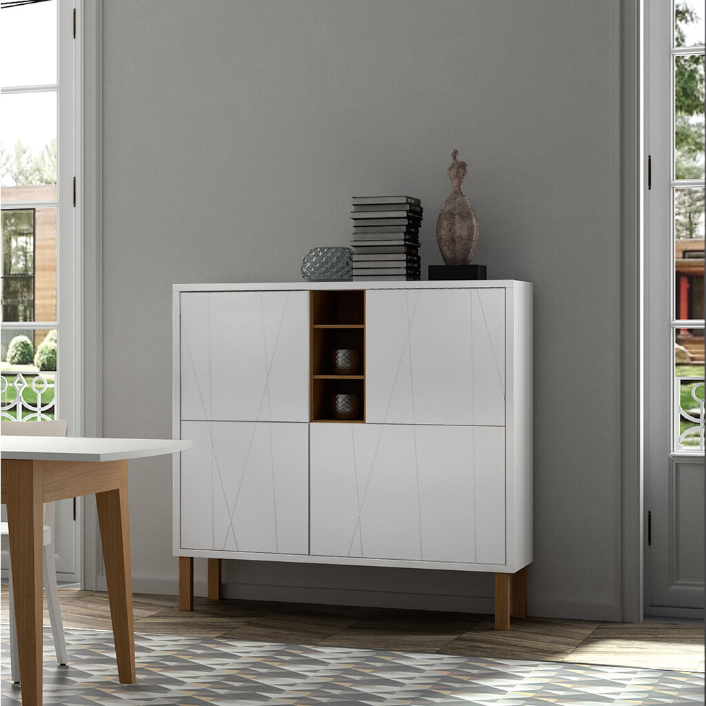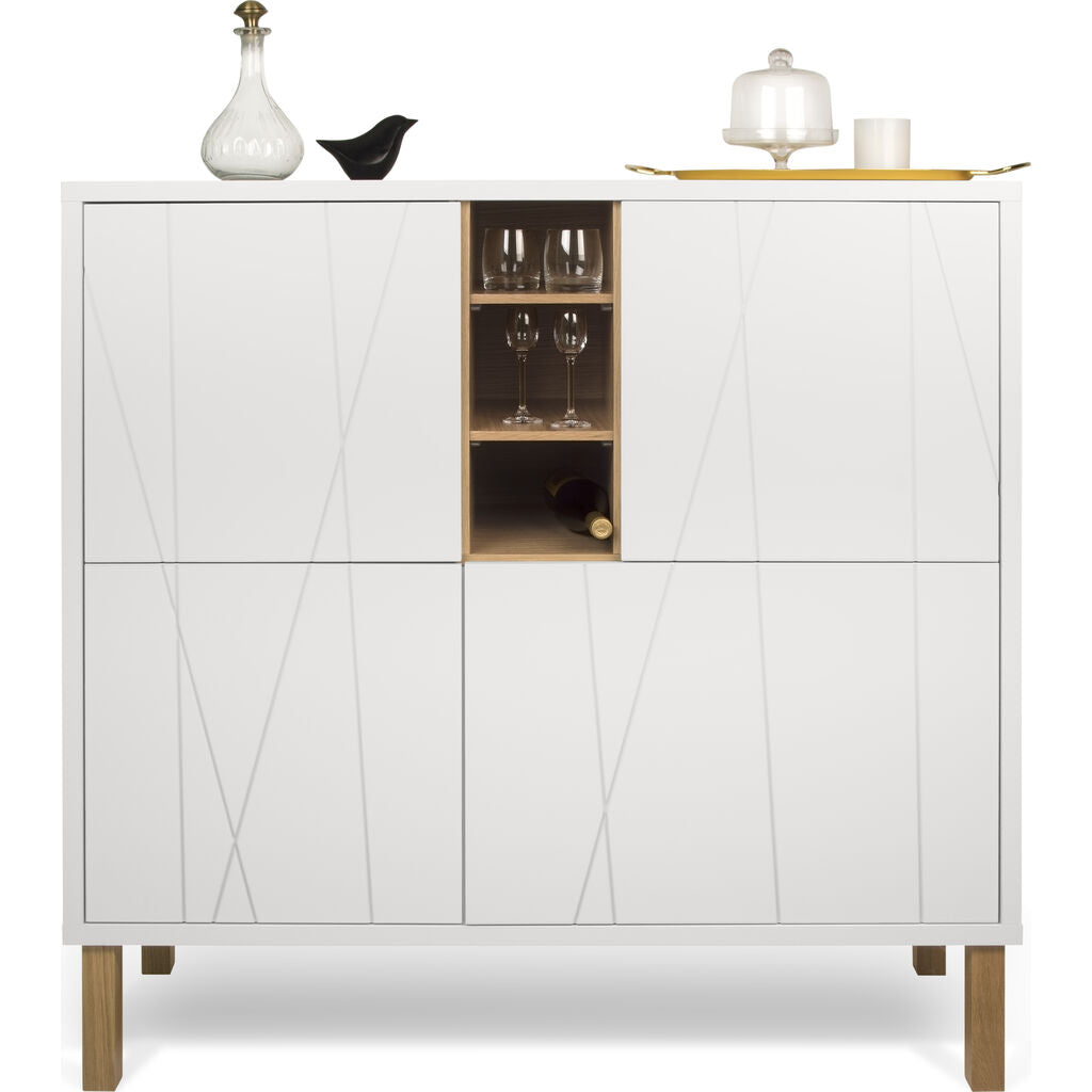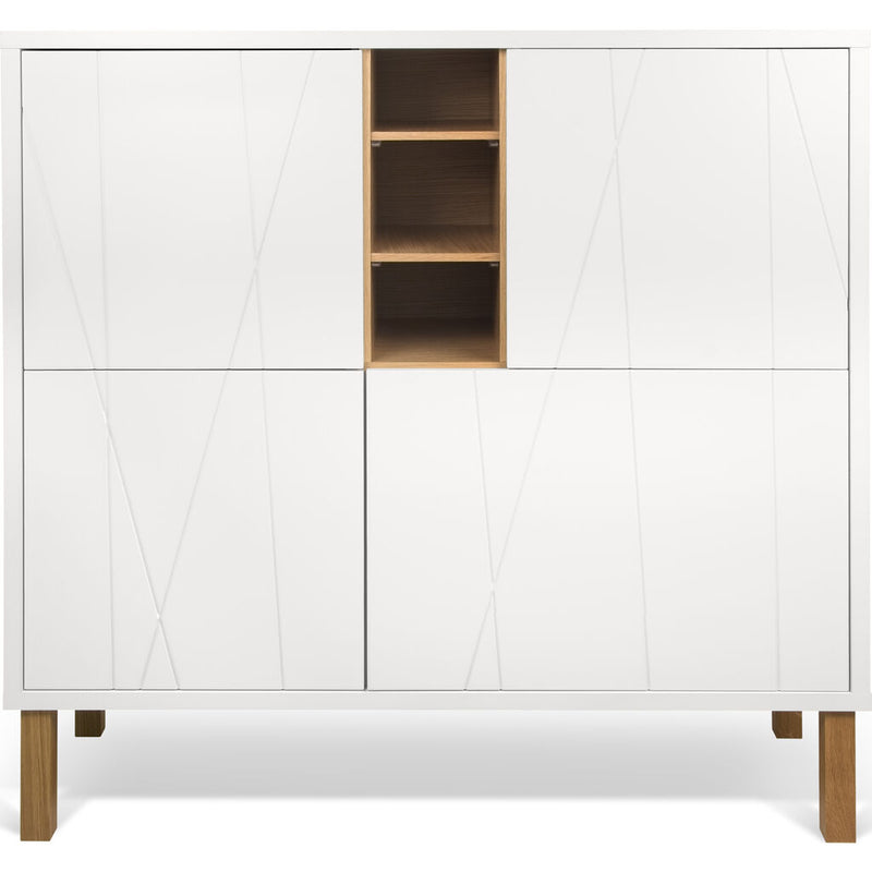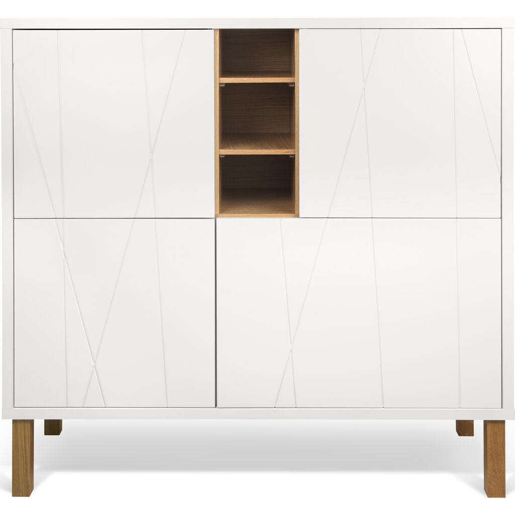 Contemporary matte white cupboard with oak legs, three oak veneered niches and notched doors. The Niche cupboard was designed around and named after the distinctive oak veneered niches that contrast nicely with the matte white elements. This unit has shelves behind each door, providing you with considerable storage space.
