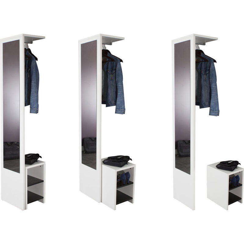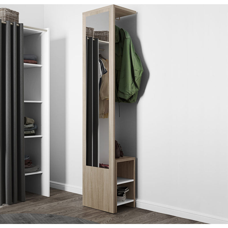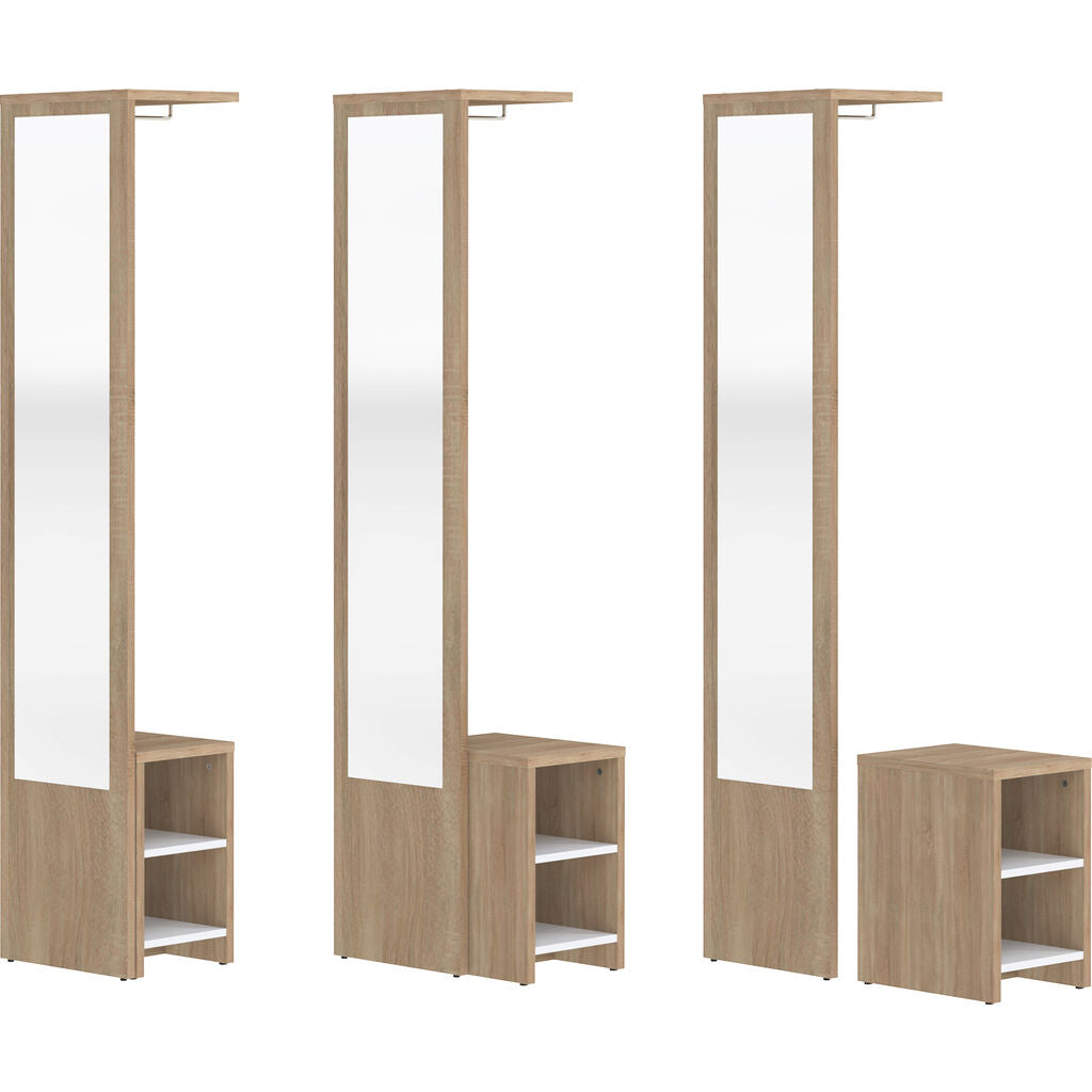 TemaHome Vestibulo Entrance Wardrobe will solve the problem for storing clothes, shoes and essentials. Vestibulo Entrance Wardrobe with bench natural oak or white, modular bench with shoe storage, white or black shelves and mirror. This stylish wardrobe is made of melamine chipboard. Vestibulo Entrance Wardrobe is suitable for your home decor.