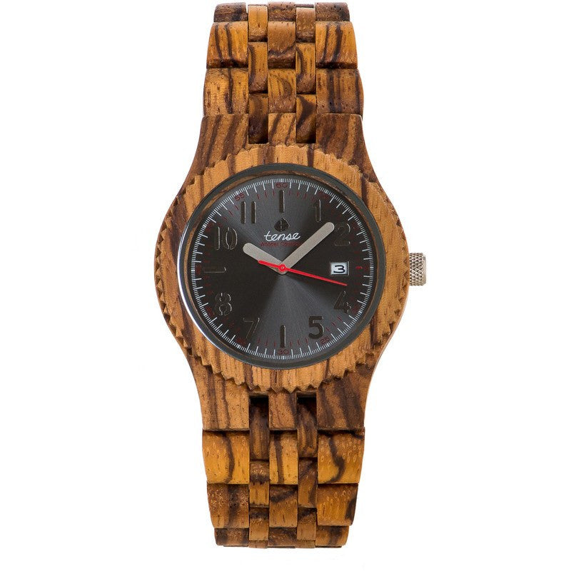 The Tense Yukon is the newest member of the Discovery Collection combining the elegance of natural wood with a classic analog timepiece with date function. The crown and automatic push-button clasp are made of premium quality stainless-steel while the all wood bracelet is hypoallergenic and adjustable to fit a range of sizes.
