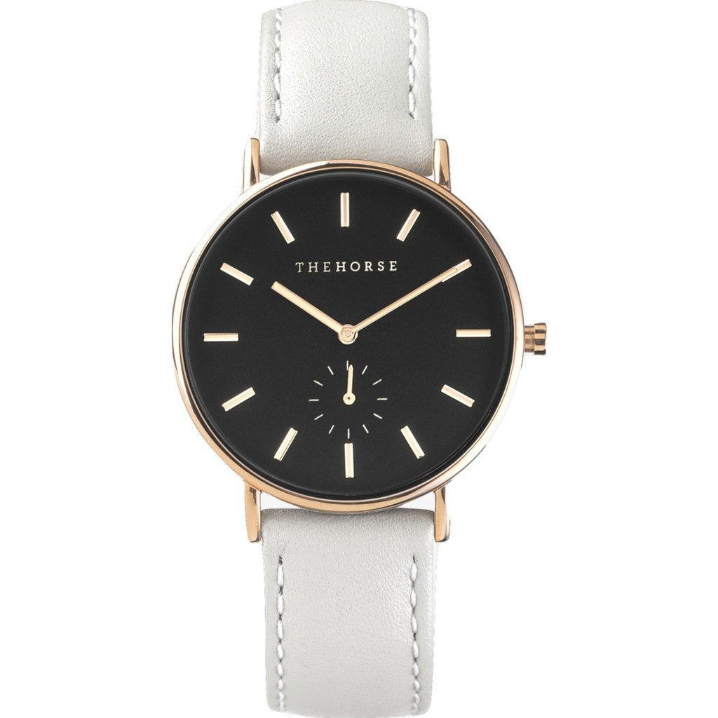 Sophisticated simplicity at its finest, The Horse brings you their Classic collection. This bold and sophisticated watch is designed with a black face, minimalist rose gold markers, and finished with a light grey genuine Italian leather band for a timeless style.