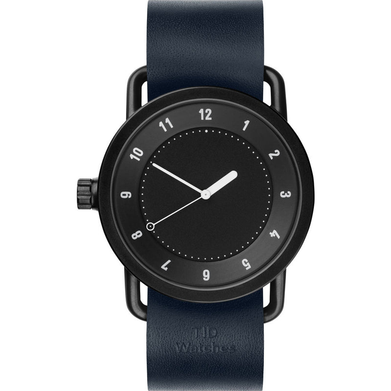 The No.1 Black and Navy Leather Watch reduces the functions of a watch to the barest of essentials. Featuring clean black face and adjustable navy blue leather strap. The TID No.1 is made of milled stainless steel and given a black ion coating for durability, providing a finish that gives it just the right amount of matte versus glass on the wrist. The only noticeable branding is punched into the side. The best all black watch out there. A minimalist watch that will go with almost everything.