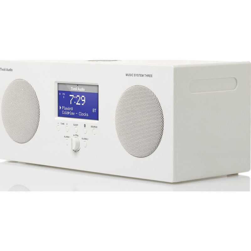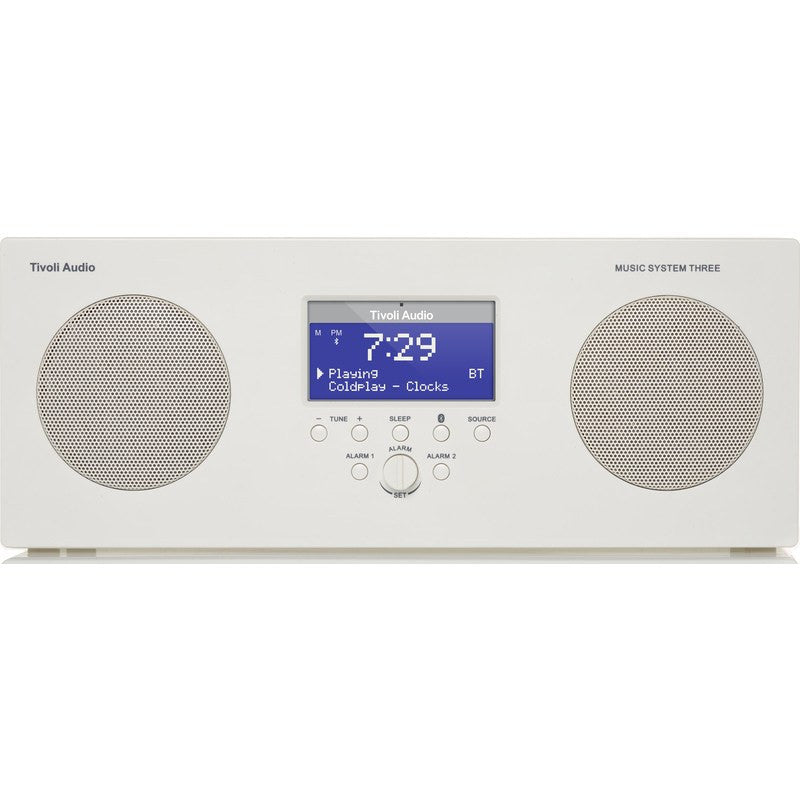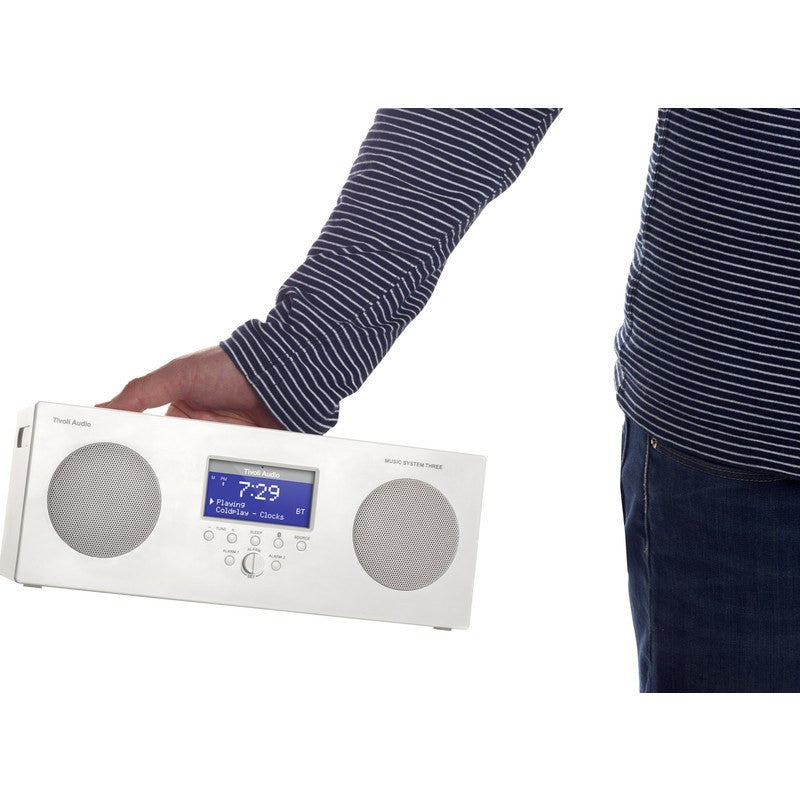 Tivoli Audio makes sure you can take great sound anywhere you go with the Music System Three Speaker Radio in White. This portable hi-fi system features bluetooth connectivity, AM/FM reception, alarm capabilities, auxiliary input and weather resistance. The built-in rechargeable battery pack allows for 20 hours of quality sound after a single charge.