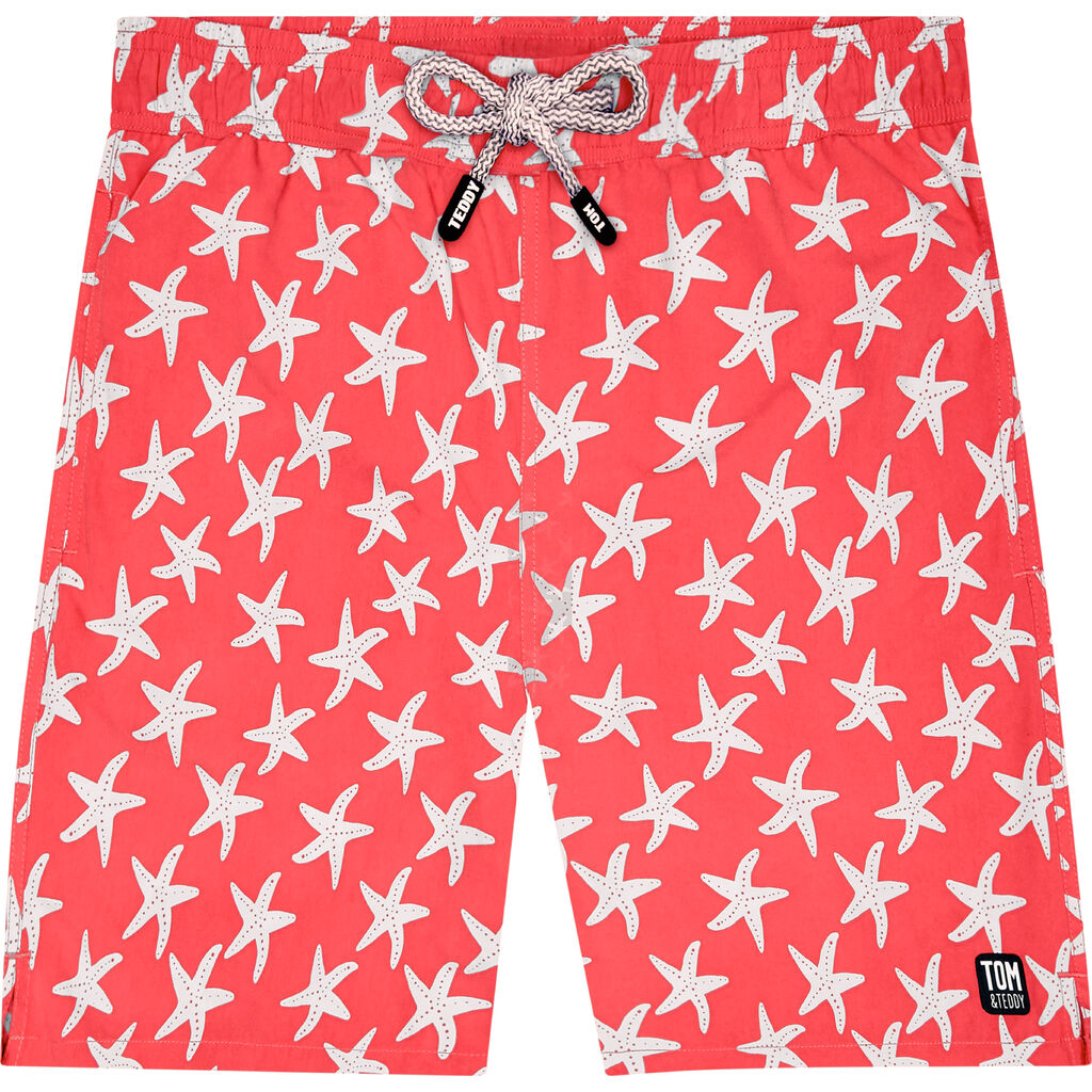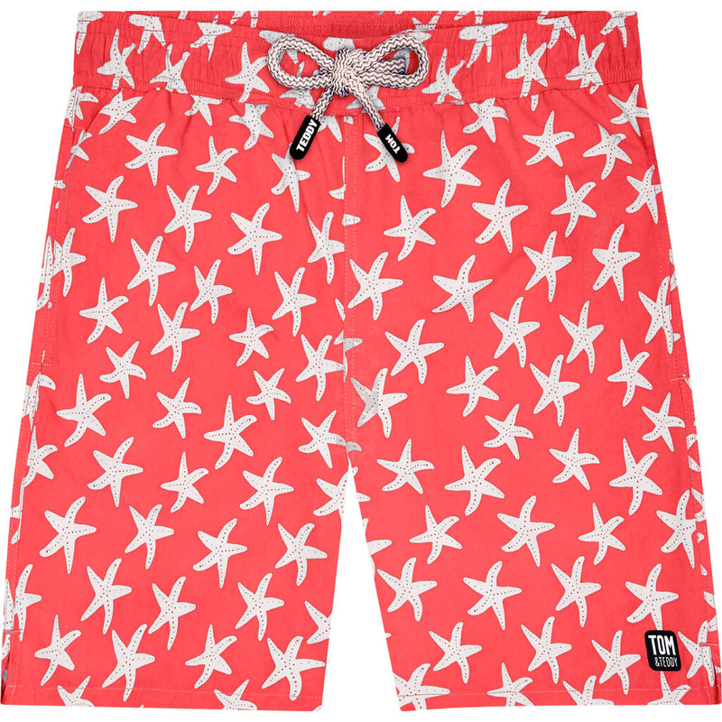 Get ready to swim with the Tom & Teddy Men's Starfish Swim Trunks. These warm rosy pink swim trunks with a blue starfish pattern have a fun eye-catching print that will brighten any day. Tom & Teddy starfish swim trunks are made with extra soft quick-dry fabric that will protect you from the sun's harmful rays without fading from chlorine or salt. A real joy to wear, both in and out of the water - perfect for a trip to the beach or the pool!