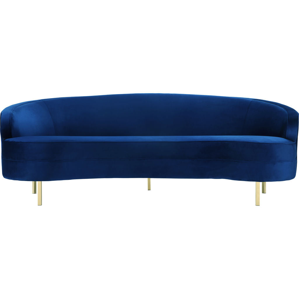 The Baila Velvet Sofa from TOV Furniture has an elegantly curved silhouette and plush navy velvet upholstery. The legs are chic, made from gold stainless steel. This glam blue sofa is the perfect addition to your living room, adding the ideal amount of elegance.