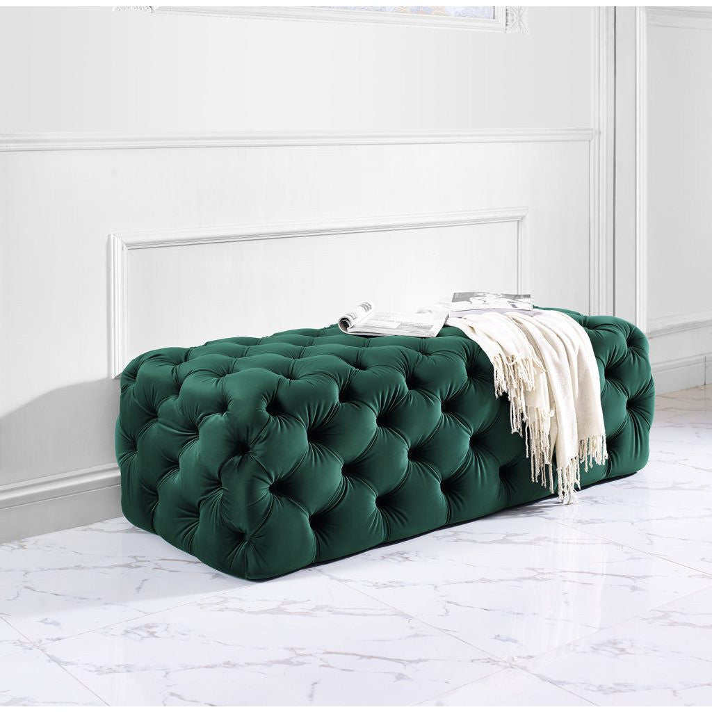 Sure to be the new centerpiece of your living room, the beautiful Kaylee Jumbo Velvet Ottoman features dramatic button tufting and gorgeous green velvet upholstery. This plush, luxe ottoman will be your new favorite piece of furniture.