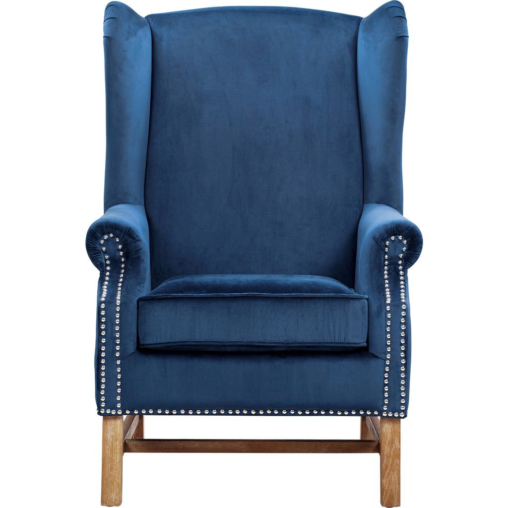Exuding comfort and warm, the Navy Velvet Nora Chair from TOV entices one to curl up with a good book and unwind. Handcrafted crafted from oak to ensure lasting support, the Nora features a lustrous navy velvet upholstery that has been accented with decorative silver nail heads. A comfortable resting place and conversation piece, this arm chair is a worth addition to any home.