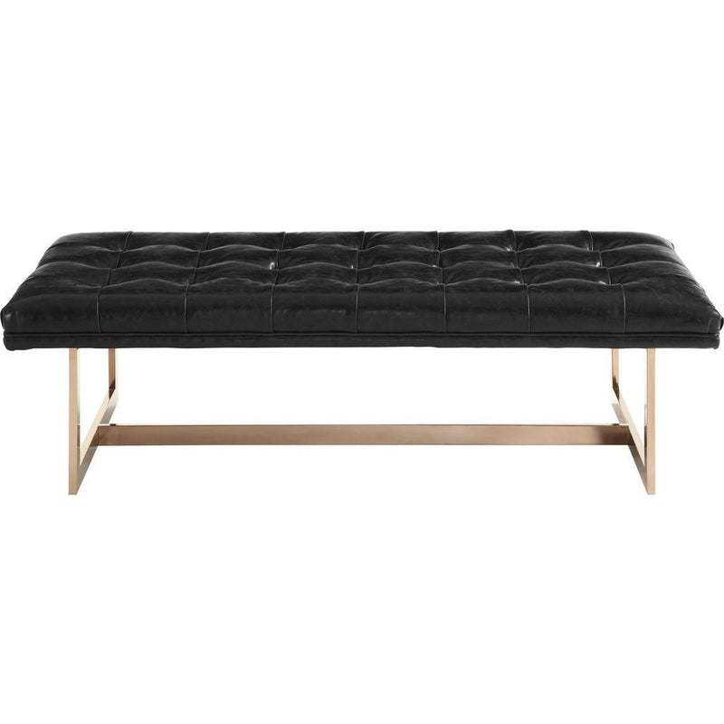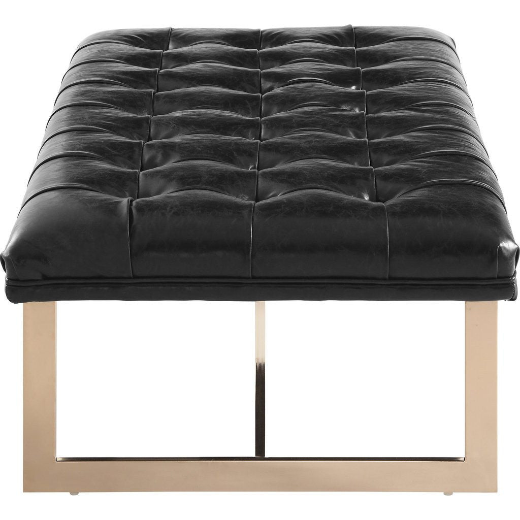Turn up the glam with the black leather Oppland Bench. Featuring gorgeous black tufted eco-leather upholstery and glossy gold stainless steel legs, this bench is sure to impress in any space from the foyer to the foot of the bed.