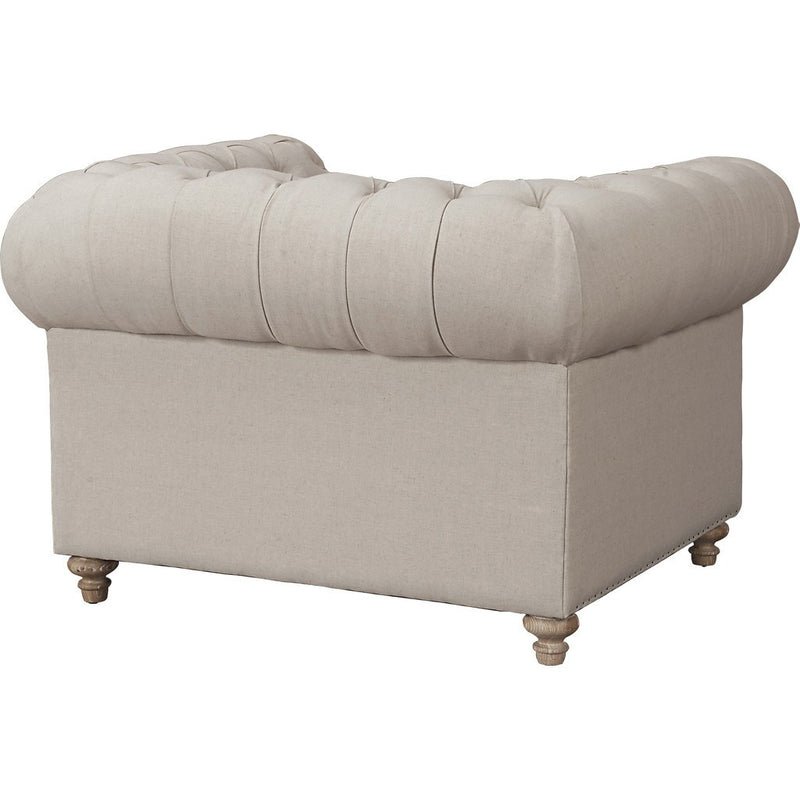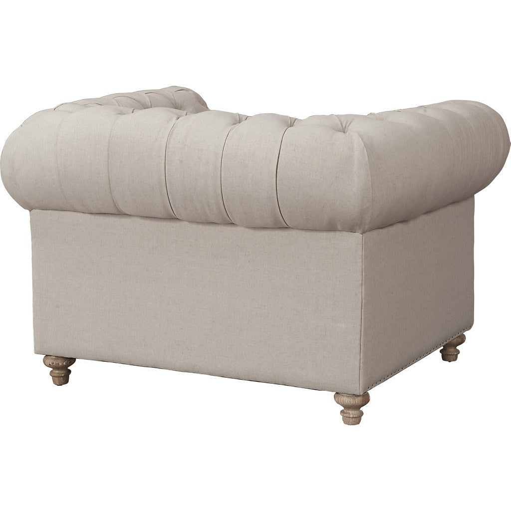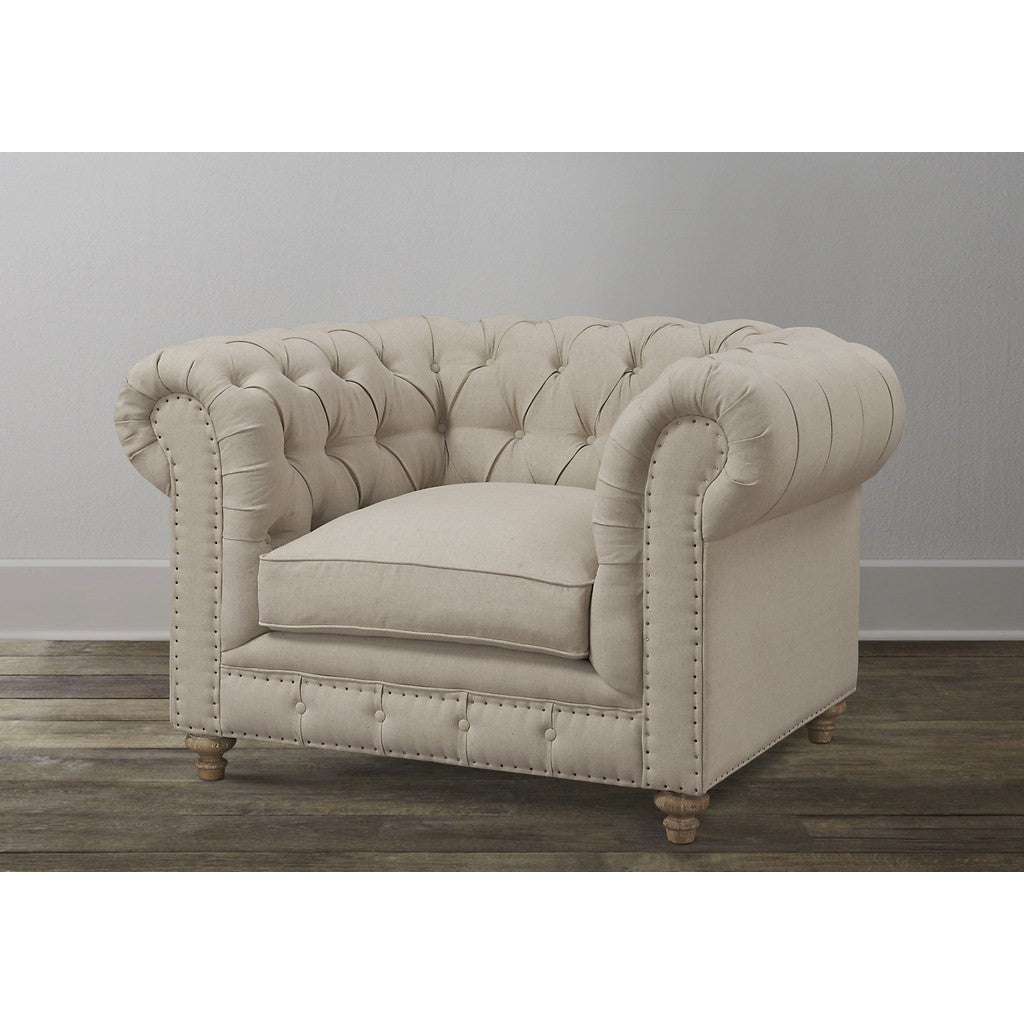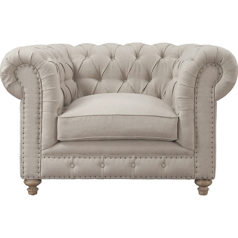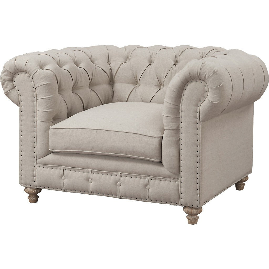 TOV Furniture puts their spin on the classic Chesterfield design with the Oxford Chair. Upholstered in beige tufted linen, and featuring a solid wood kiln dried frame, hand-hammered shoe nail heads, and a feather down cushion, this chair is sure to impress.