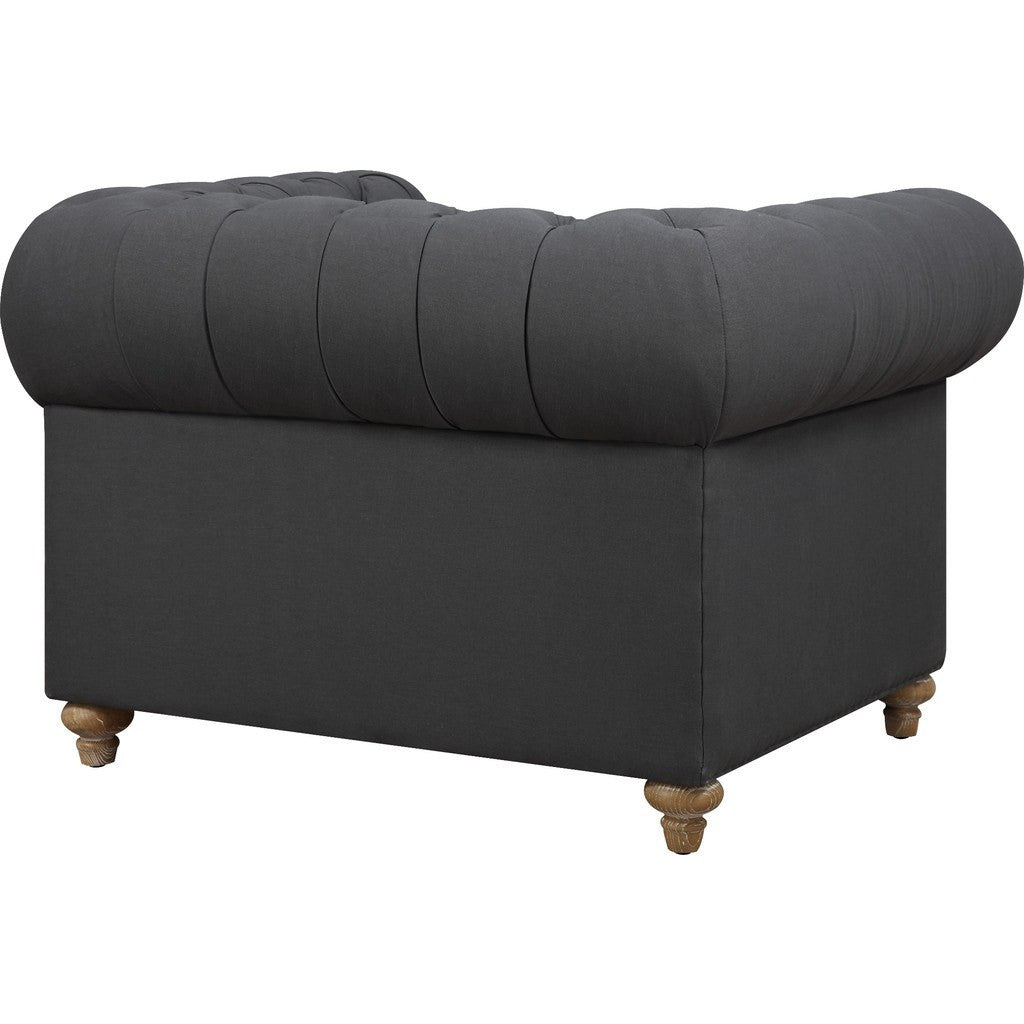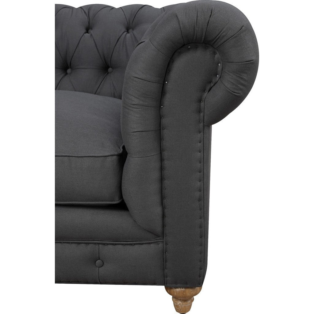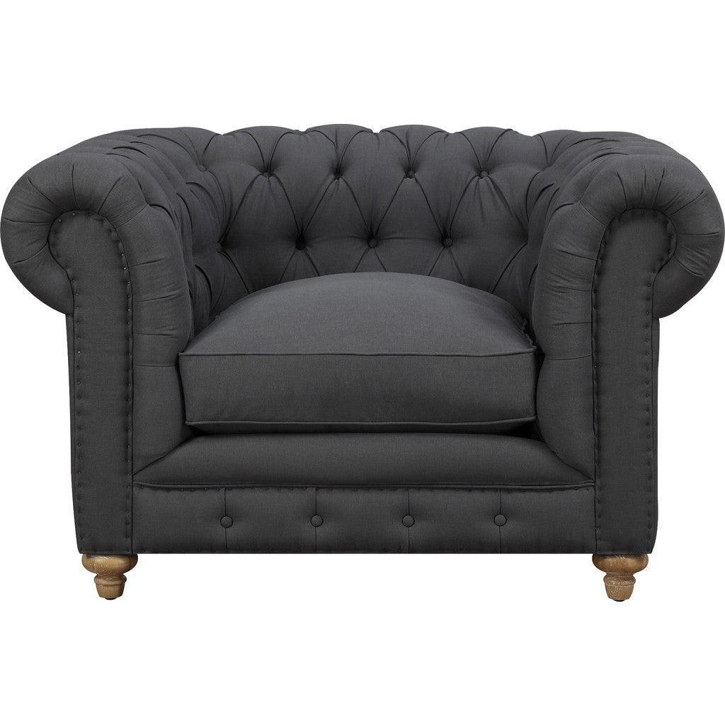 TOV Furniture puts their spin on the classic Chesterfield design with the Oxford Chair. Upholstered in grey tufted linen, and featuring a solid wood kiln dried frame, hand-hammered shoe nail heads, and a feather down cushion, this chair is sure to impress.