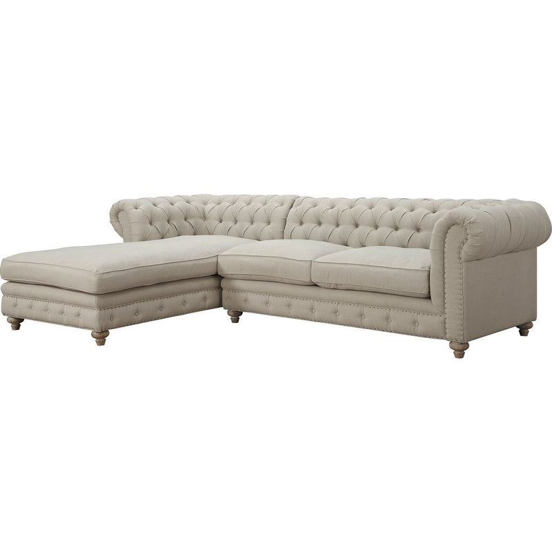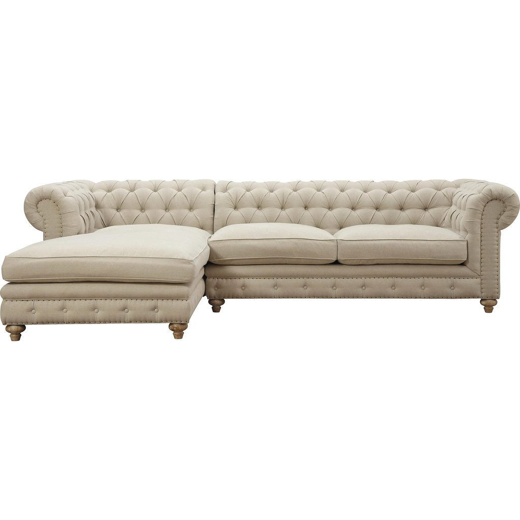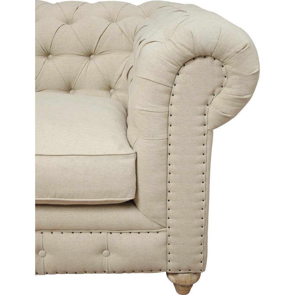 TOV Furniture puts their spin on the classic Chesterfield design with the Oxford Sectional. Upholstered in beige tufted linen, and featuring a solid wood kiln dried frame, hand-hammered shoe nail heads, and a feather down cushion, this couch is sure to impress.