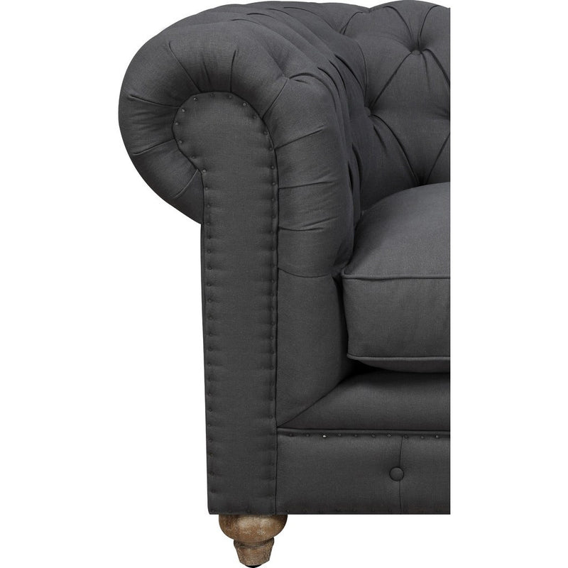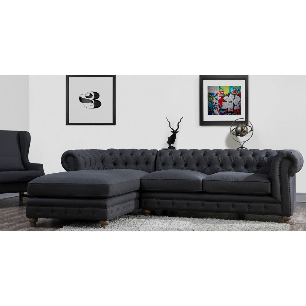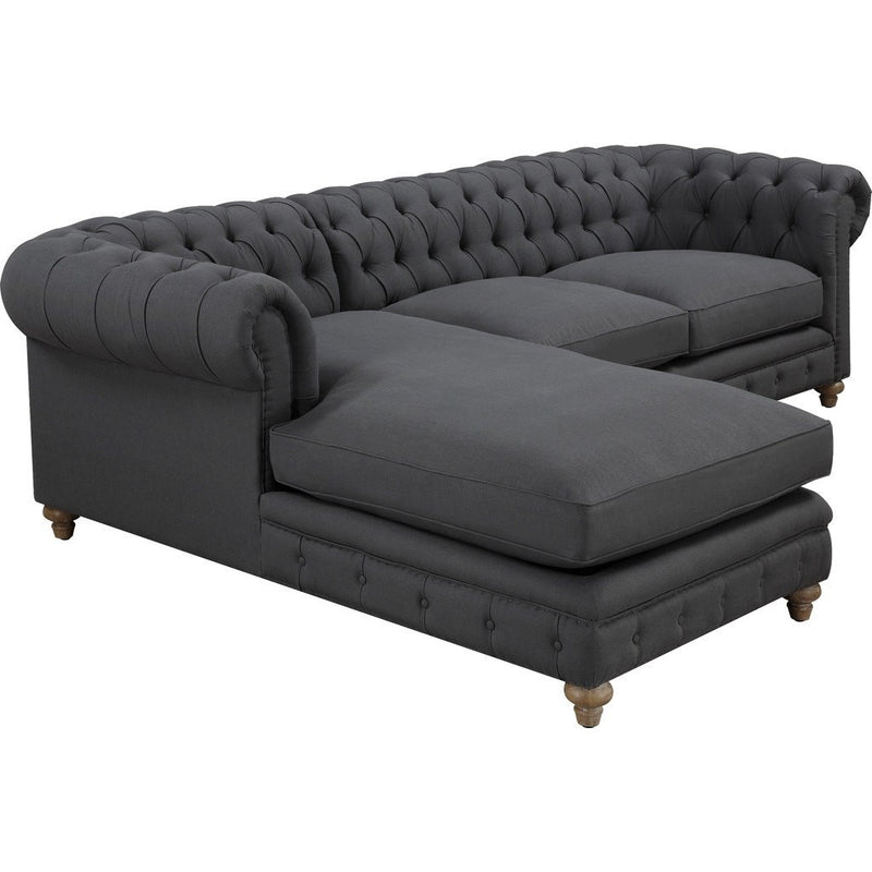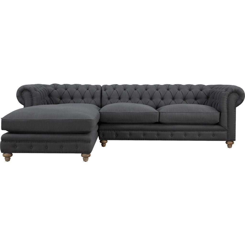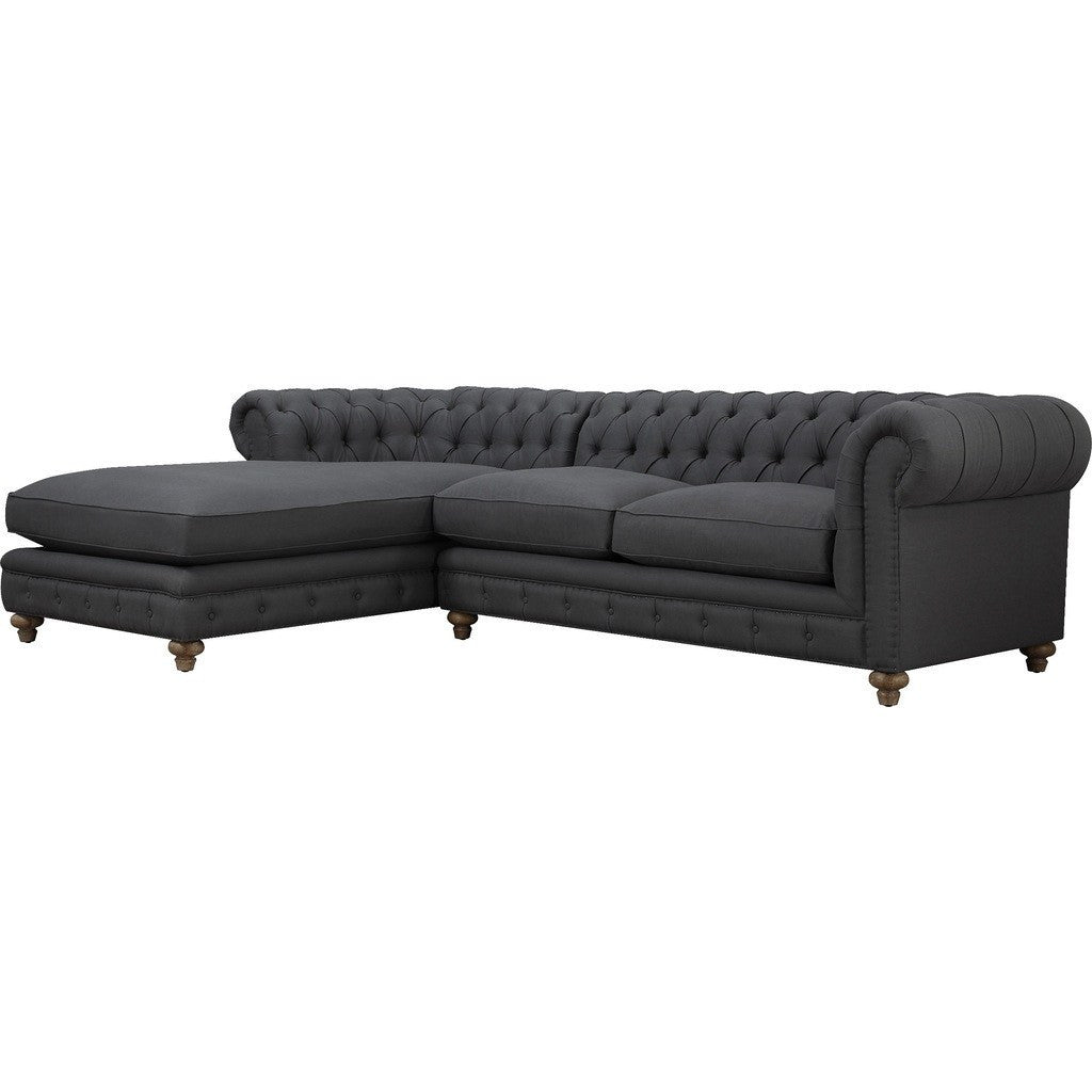 TOV Furniture puts their spin on the classic Chesterfield design with the Oxford Sectional. Upholstered in grey tufted linen, and featuring a solid wood kiln dried frame, hand-hammered shoe nail heads, and a feather down cushion, this couch is sure to impress.