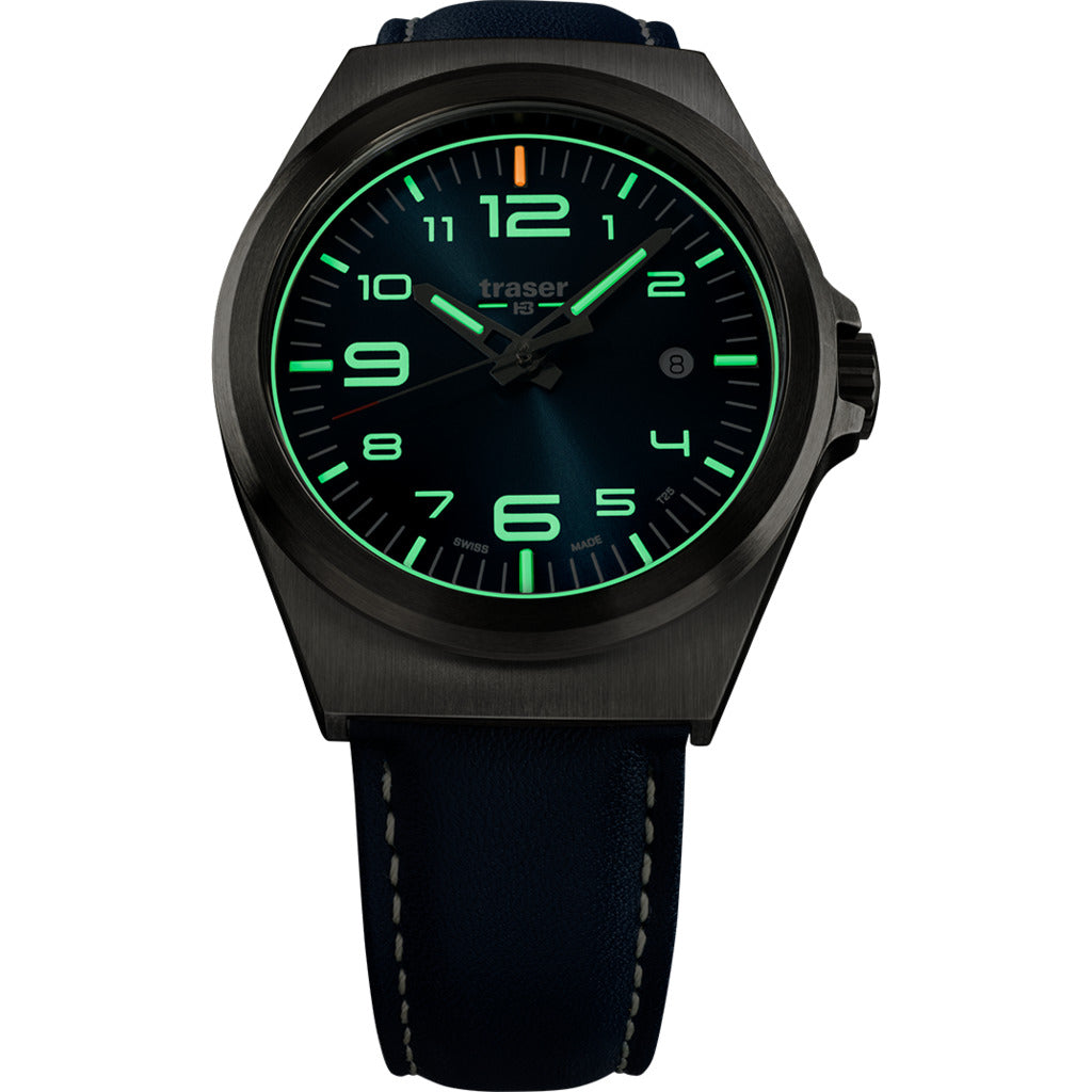 Take your day watch to night with traser H3's Blue Essential M Watch and Blue Leather strap that illuminates in the dark. Built with trigalight® and Super-LumiNova technology for a bright glowing time display. The elegance design and blue accents makes this timepiece into a starry sky. Made with Swiss quartz movement, anti-reflective sapphire, and stainless steel to handle every day wear. This Essential M watch will give you no worries with its classic and sophisticated design that is suitable for every occasion.
