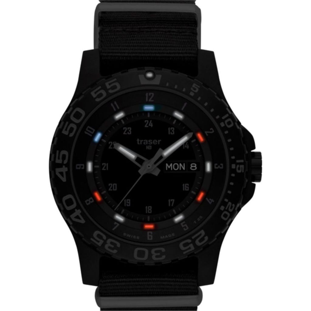 traser H3 put the way we see time in a mesmerizing display with the P66 Shade RWB watch with Back Nylon strap. This special edition model is equipped with red, white, and blue continuous glowing tritium tubes. The black PVD-plated trigalight® insert on the bezel, AR sapphire crystal, and a day-date indication with white text on a black background. The Shade Red White Blue watch features a 45mm double case construction with glass-fiber reinforced resin as an outer case and steel as the inner case for protect you do't have to worry about. A refreshing time display and all-black details make this timepiece cool with a touch of interesting.