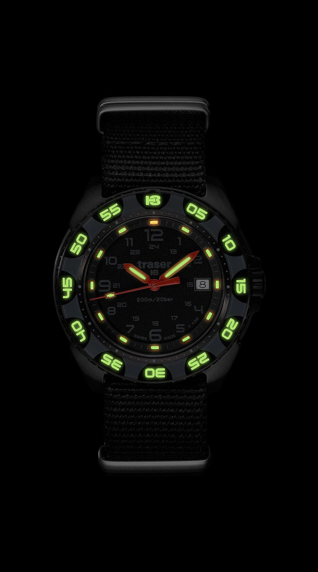 - Illumination: 1-11 green, 12 orange, H/M/SE hand green, bezel green