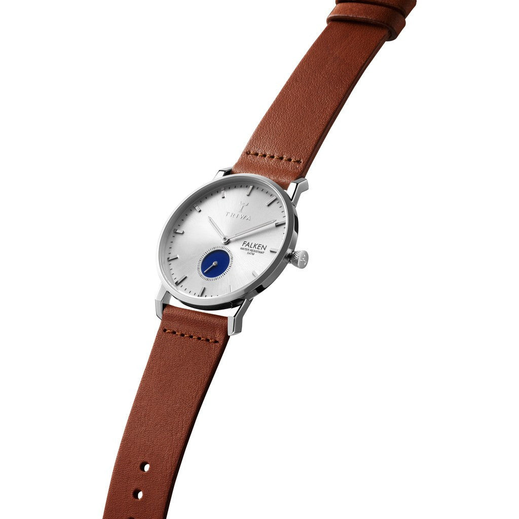 Triwa blends sophistication with functionality with the Blue Eye Falken Watch. The Falken boasts water resistance up to 5 ATM, a silver case, a silver and Klein blue sunray dial, and Citizen Miyota movement. Finished with a Brown Classic leather strap, this watch brings the perfect touch of elegance for those who live an active lifestyle.