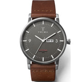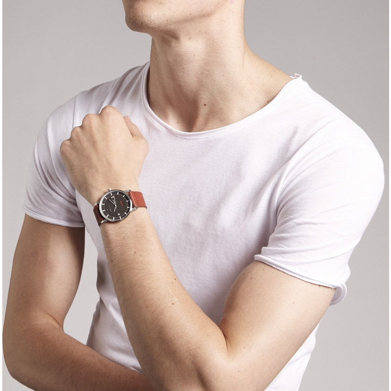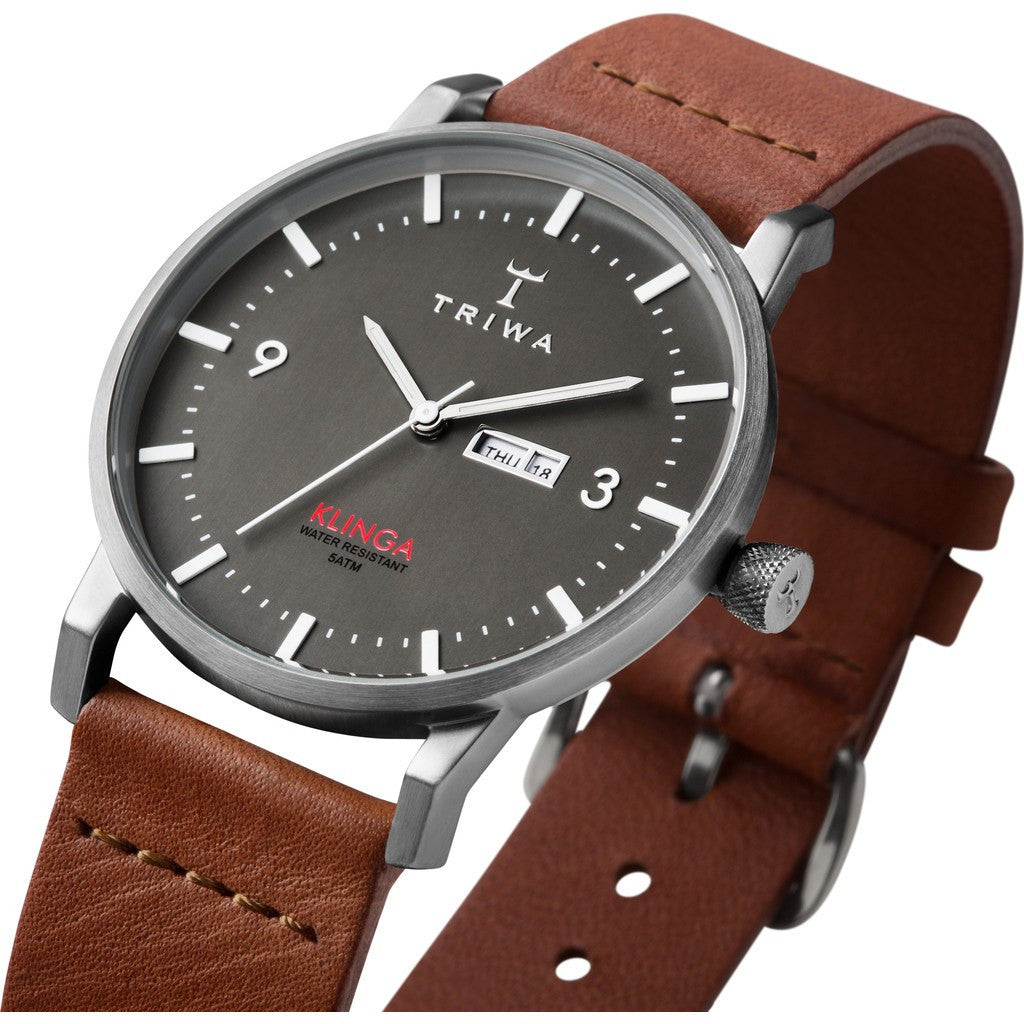 The Brown Classic Dusk Klinga Watch by Triwa is an elegant classically styled watch great to wear with business, dress, or casual style clothing. The brushed case gives this analog watch an elegant look. Finished with a brown leather band, the Dusk Klinga is versatile with any ensemble. The dark dial lets the all-white hands pop, while the little window on the right side of the dial displays the day and date.