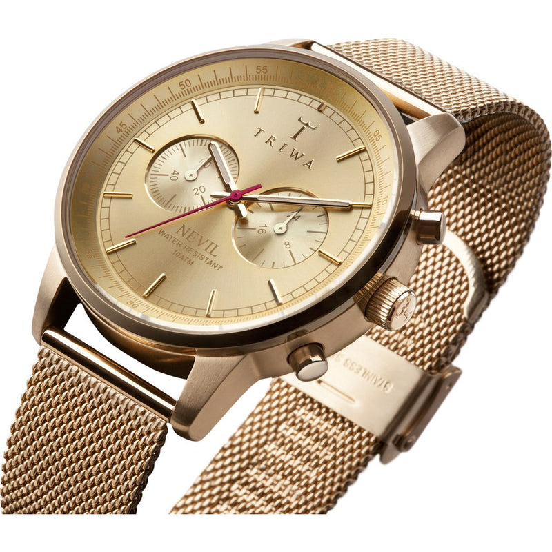 Sophistication and functionality come together with the Gold Mesh Nevil Watch. This model is a cornerstone addition to the Triwa chronograph family that blends contemporary and classic with a sleek design. It balances sportiness with elegance that makes this watch an experience to have, perfect for a touch of class for those who live an active lifestyle.