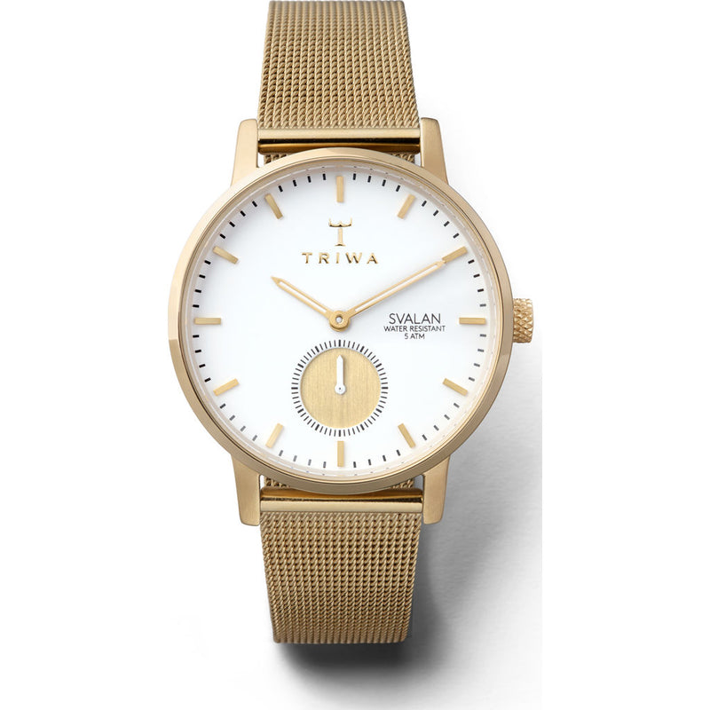 Triwa's best selling styles have been revamped with a feminine touch for a refreshing color palette and delicate size elegant. The Ivory Svalan watch with a Gold Mesh Super Slim strap. Even with the slim design, this eye catching design is bold in the prettiest way. A white dial set within a gold case with a petite gold mesh strap, makes this model all feminine.
