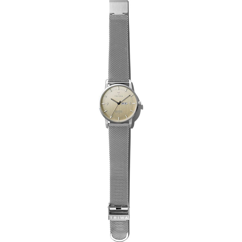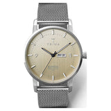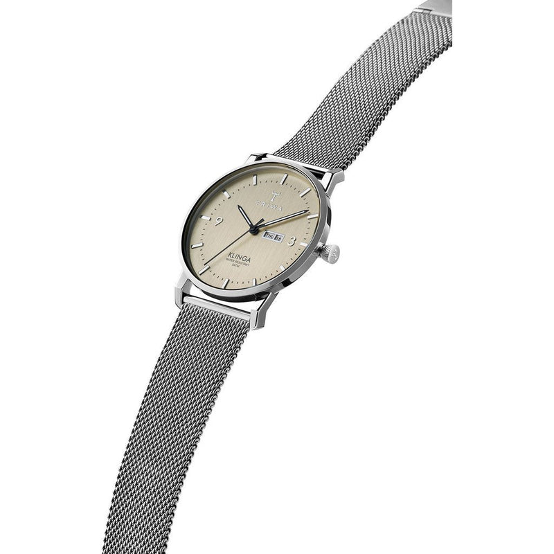The Birch Classic Dawn Klinga Watch by Triwa is an elegant classically styled watch great to wear with business, dress, or casual style clothing. The round silver face and hands give a classic look to this lovely analog style watch, featuring a black leather band that is versatile with any color of outfit along with the silver buckle. The white on white dial adds subtle, understated classiness while the framed date display is clearly visible on the right side near the center of the dial.