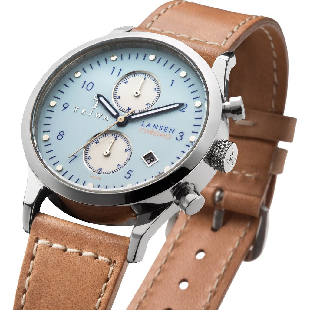 Triwa crafted the Sky Lansen Chrono Watch with a Tan Sewn Classic strap. The light blue dial has intricate details, with dual colored hands, blue markers for the minutes, and white markers to indicate the hour. This chronograph watch is finished with a stainless steel case for a look that can easily go from day to night.