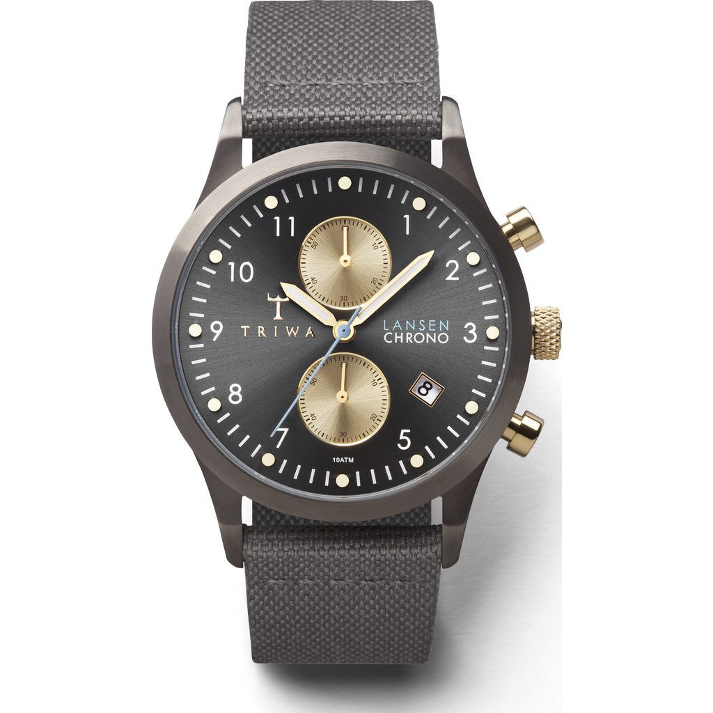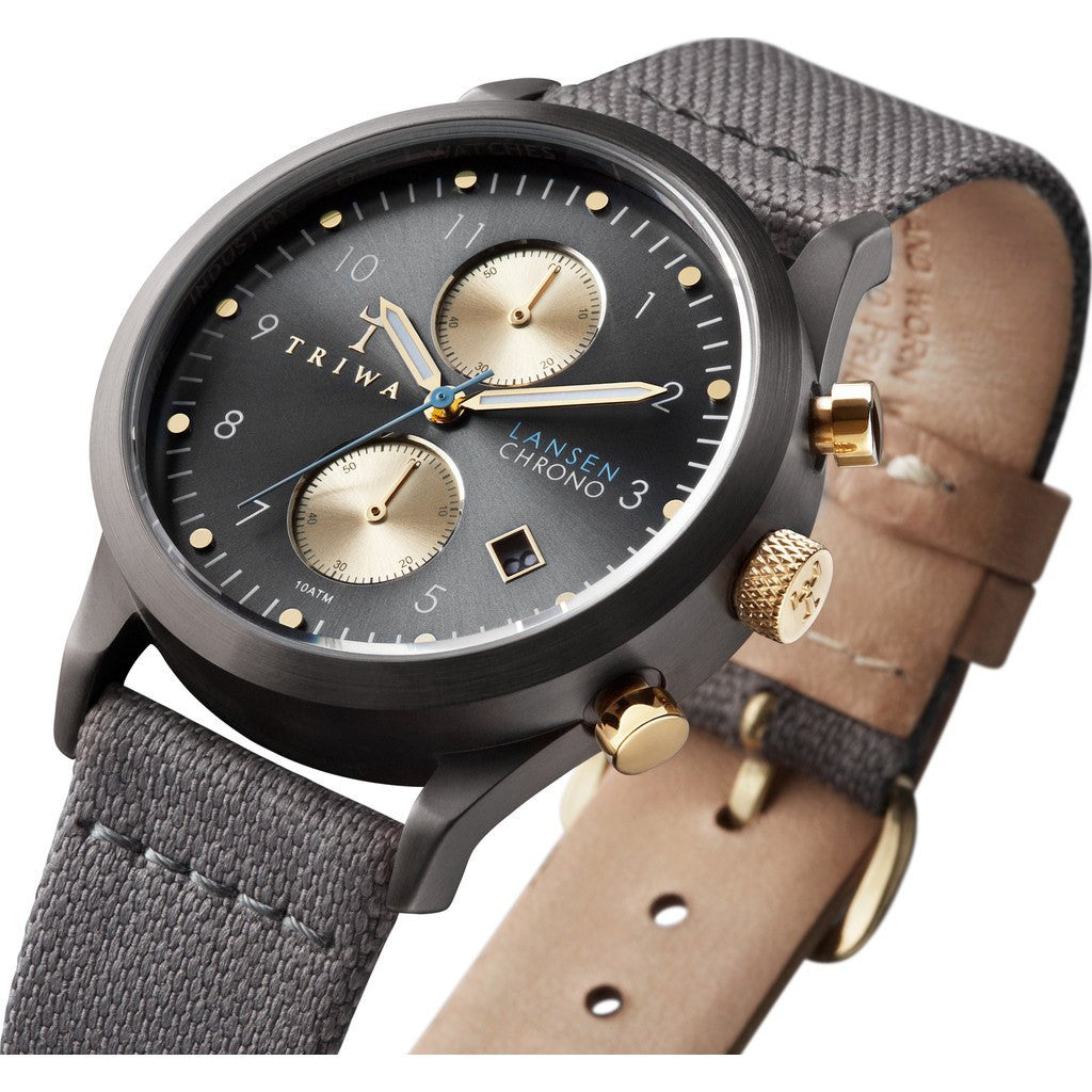 The Triwa Walter Lansen Chrono Watch with classic gray canvas is a beautifully designed watch fashioned with a sundial face. The hour and minute hands are styled in white while and gold. This classic lug style watch is a treasured timepiece. The beautiful yet casual gray canvas strap is both durable and fashionable.