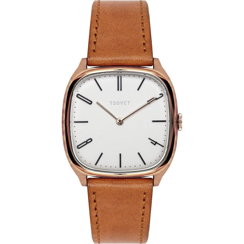 The Tsovet JPT-TW35 breaks the circular mold with a distinctly square dimensions yet softly rounded corners. The compact 35mm case is perfectly balanced to deliver both classic and elegant style, seated on a tan leather strap with matching stitching. Each component of the JPT-TW35 casual watch is hand built under the strictest of standards and verified by Tsovet.