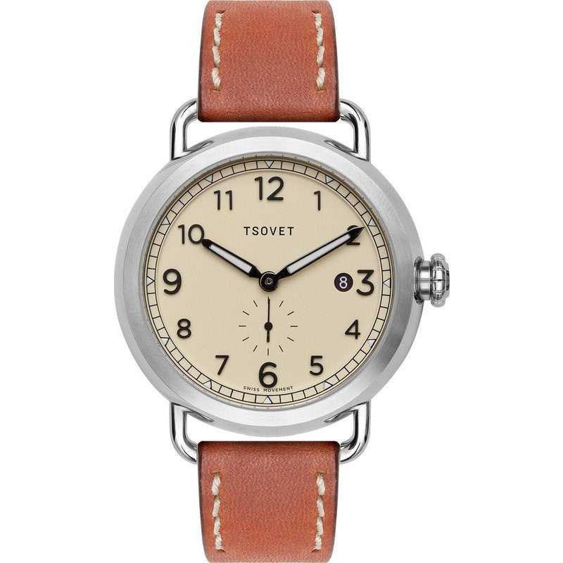 The Tsovet SVT-CV43 Watch boldly marries traditional aesthetics with modern design. The rounded edges of the exterior case wall are inspired by classic pocket watches with a contoured wire lug, honoring the TSOVET 1.0 collection. Modern elements include an eloquent curved profile view, an extended crown tube, and a recessed case back that sits flush with the 43mm case, making it optimal for various sized wrists.