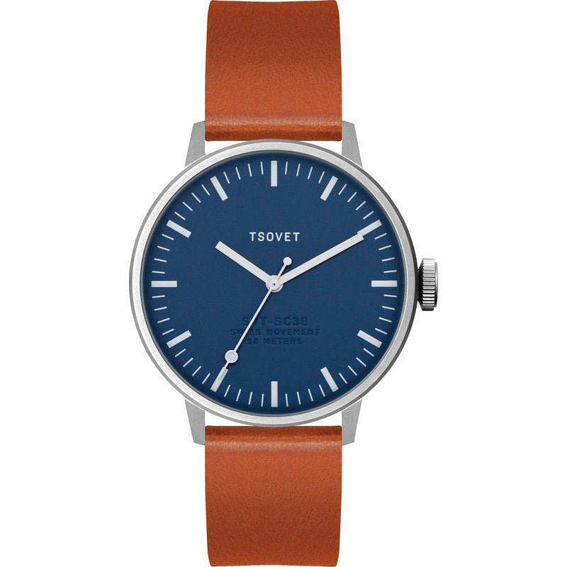 Built on the foundation of simplistic form and function, the field-ready Tsovet SVT-SC38 Watch achieves both attributes effortlessly. The 38mm case is comprised of 316-L stainless steel and houses a Swiss Quartz Movement. A bubble mineral crystal, vegetable dyed Italian leather strap, and traditional dial markings finish this elegant, but rugged, time piece.