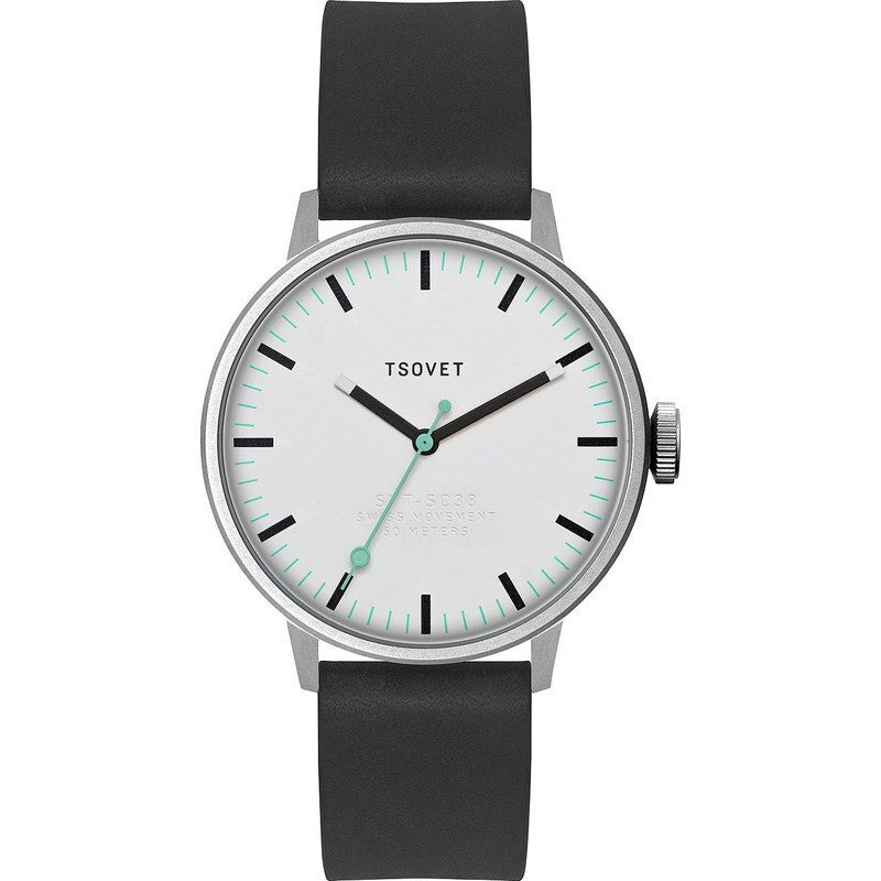 Built on the foundation of simplistic form and function, the field-ready Tsovet SVT-SC38 Watch achieves both attributes effortlessly. The 38mm case is comprised of 316-L stainless steel and houses a Swiss Quartz Movement. A bubble mineral crystal, vegetably dyed Italian leather strap, and traditional dial markings finish this elegant, but rugged, time piece.