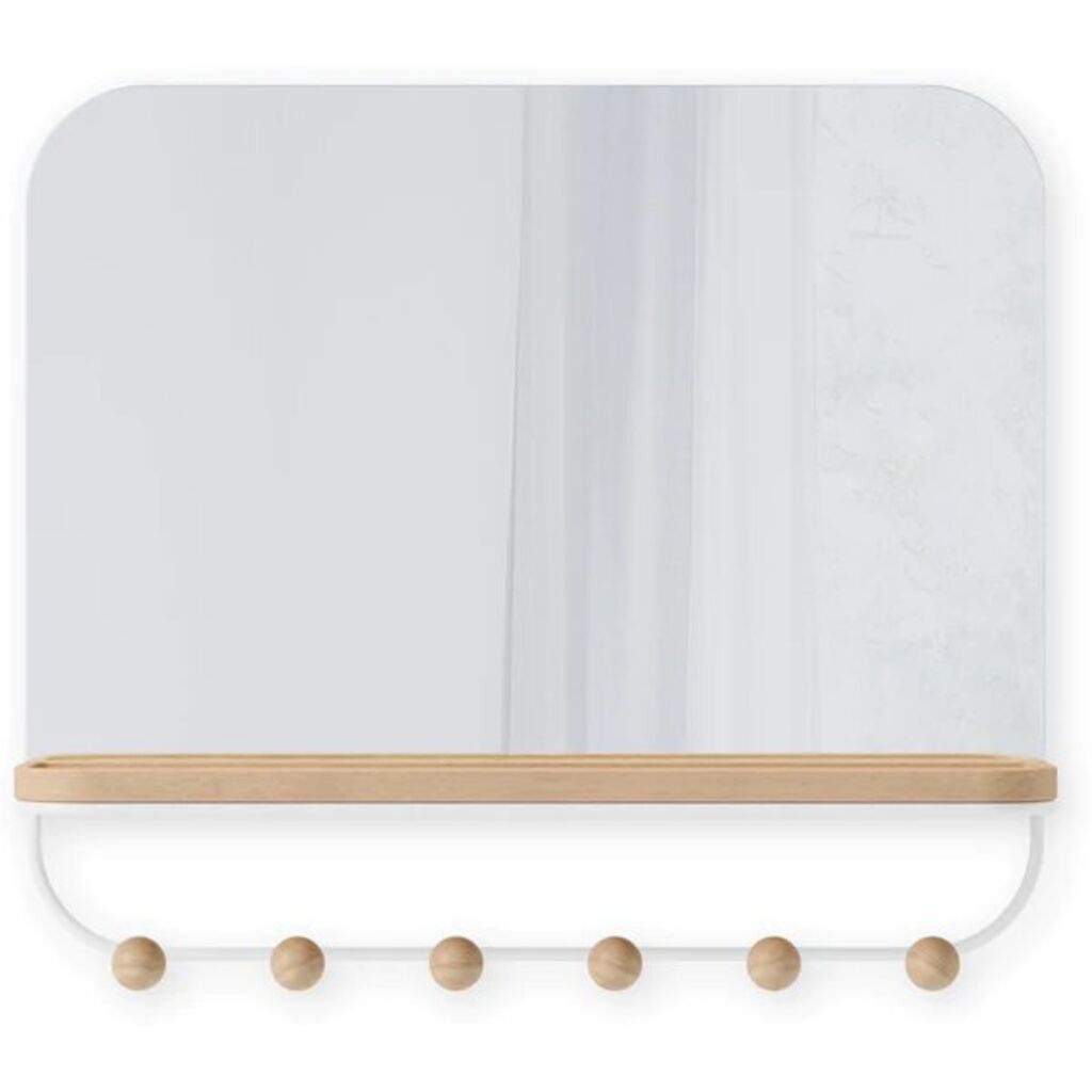 A mirror with integrated storage, Estique features six wooden hooks to protect items while adding a decorative touch. Its integrated tray is perfect to hold your phone, wallet, keys, candles and more, while its mirror provides functionality to touch-up before heading out the door. Its modern mix of wood and metal make it a decorative storage solution that will look great in any home or office space. Maximum capacity of 35 lbs. (16kg) including the hooks and tray.