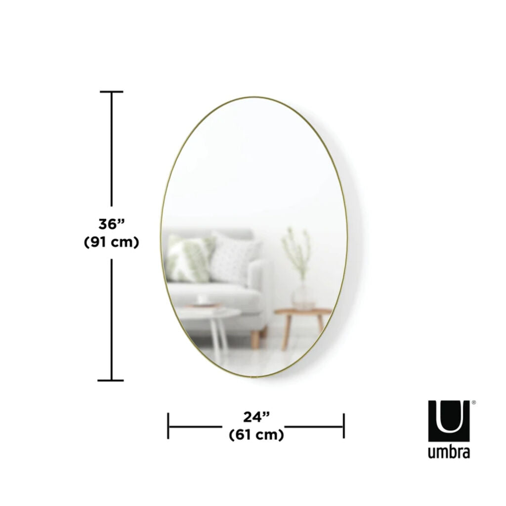 A new shape to the Hubba Family, this oval mirror features smooth rounded curves. Its decorative metal frame has a look that is sure to complement any decor. Hubba bounces natural and artificial light around the room, helping to brighten even the darkest of space. It also adds visual depth, which instantly makes smaller rooms appear bigger. Its unique, oval shape measures 24 x 36 inches (61 x 91 cm).