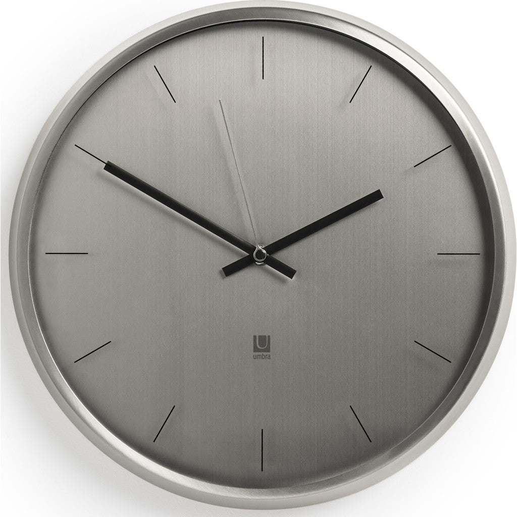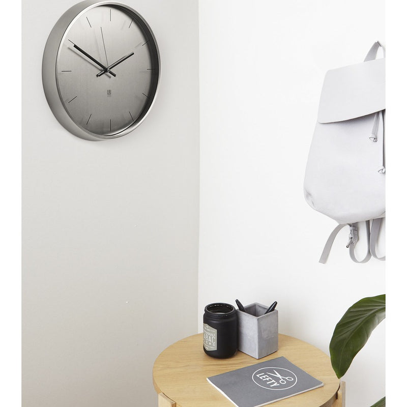 This elegant yet understated clock blends an industrial aesthetic with soft lines for a unique and versatile look. An all-metal face and frame in nickel with minimalist numerals and hands really gives a sophisticated vibe that is sure to complement any space.