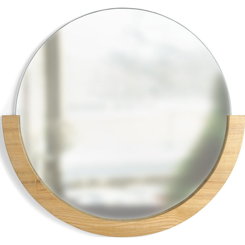 The Mira Mirror is a circle mirror featuring a half-circle wooden frame for a unique and modern design. This mirror is both functional and decorative and is sure to complement any room in your house.
