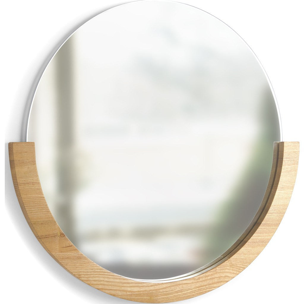 - Circular mirror supported by a semi circle wood frame on the bottom half