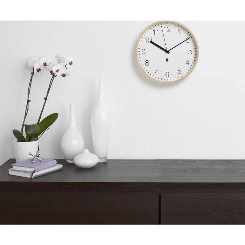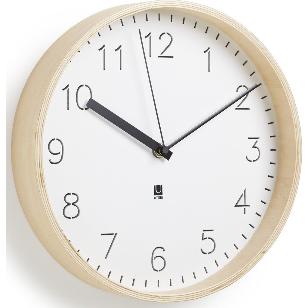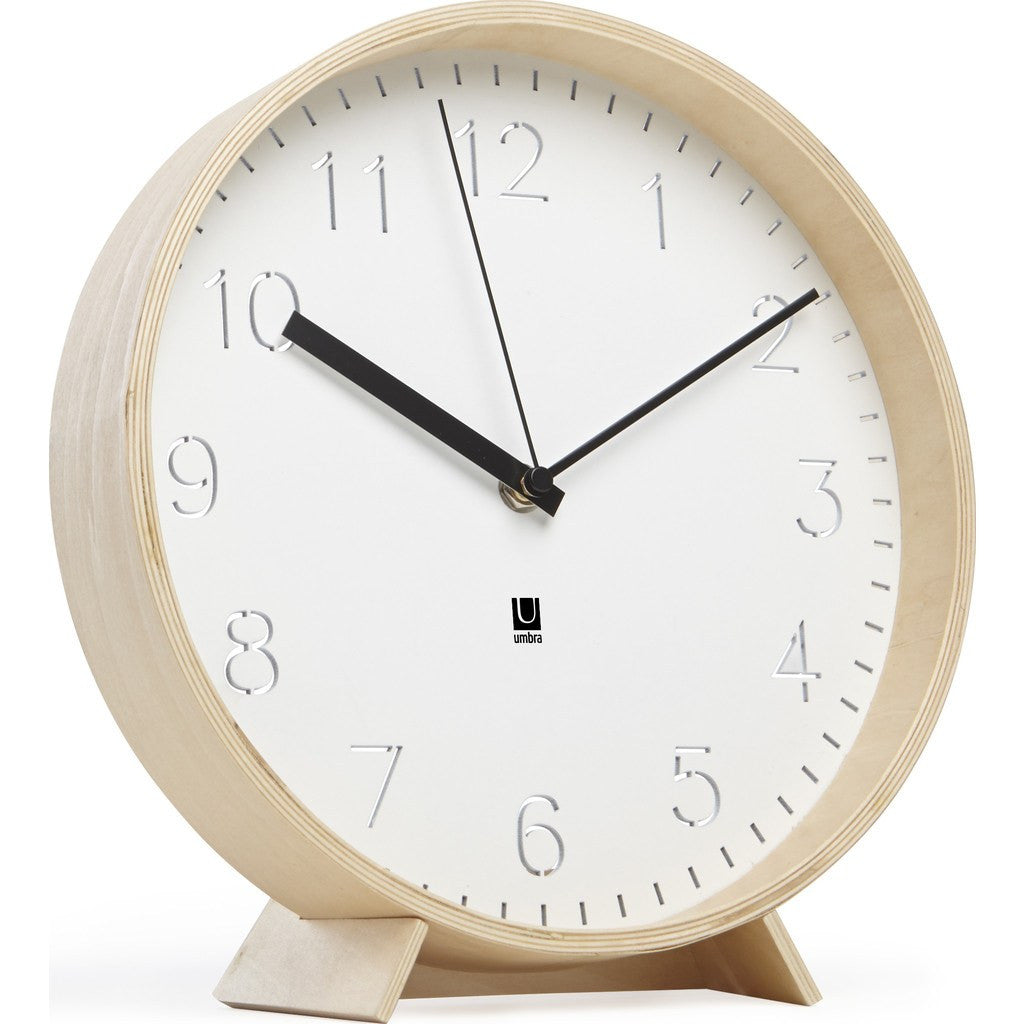 This simple yet refined wall clock features a classic white face with perforated numerals, enclosed in a natural wood frame. Versatile enough for just about any room and has the ability to be mounted or propped on its stand on a table or desk.