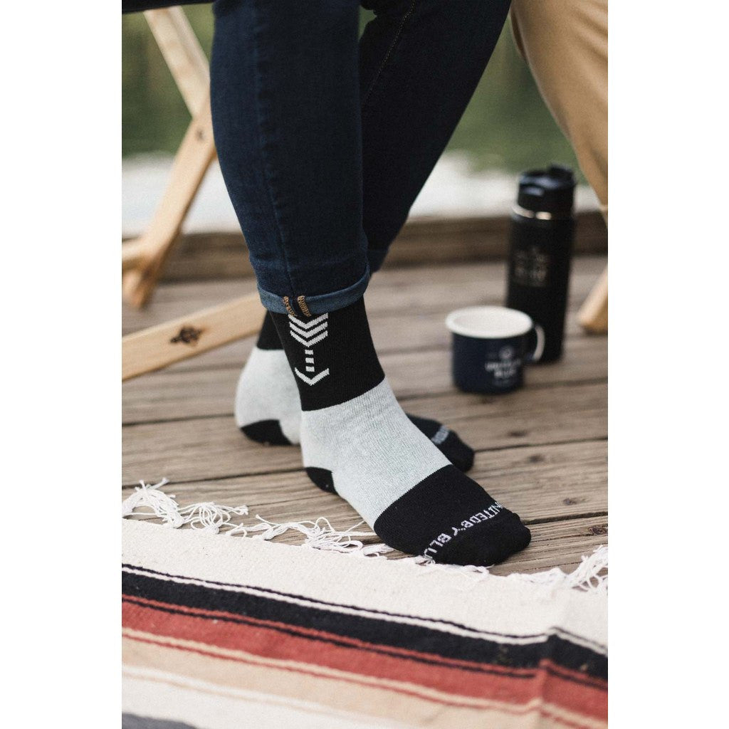 Made with recycled cotton, the United By Blue Bartrams Socks in Aqua Arrow are stylish, comfortable, and perfect for everyday wear. These socks include light padding to keep your feet cozy during those long days. For every product sold, United By Blue removes one pound of trash from our world's oceans and waterways.