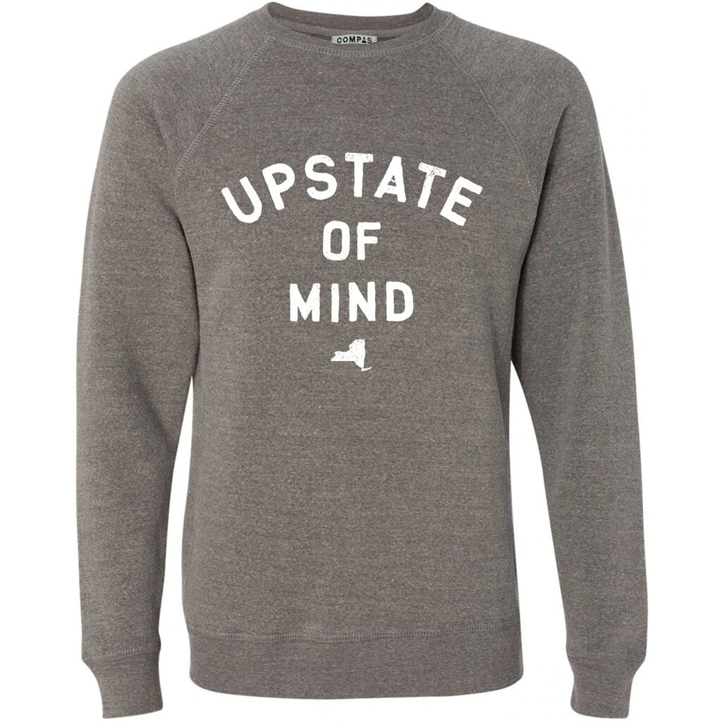 The Upstate of Mind Crewneck is a super soft polyester/cotton blend fleece. We used the finest inks for soft cozy feel on this graphic fleece.