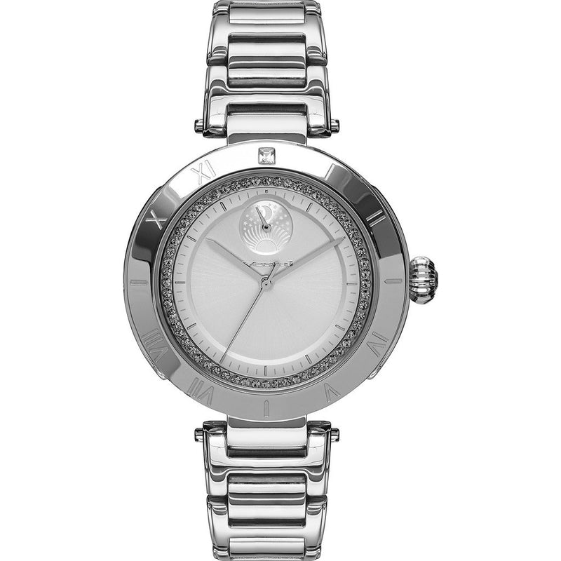- Stainless steel case includes etched Roman Numeral Bezel with 2mm Swarovski square stone