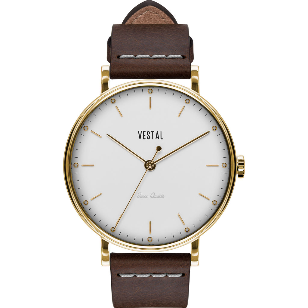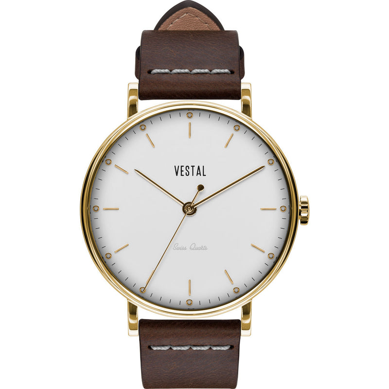 There is something to be said about a reliable timepiece that is equipped with quality materials and high character. The Sophisticate Italian Leather Watch from Vestal’s watch lineup is the best choice. Not only are their timepieces consistently reliable and precise, but Vestal's excellence and resilience is what separates them from other watch companies. Vestal watches are great accessories for any special occasion. The Sophisticate is furnished with a Dark Brown Italian leather strap that harmonizes beautifully with the gold case and white dial. Some traditional features include a stainless-steel case with an extra thick raised crystal and screw-down logo plate. The sleek design of the Sophisticate Series watches makes them the best option to wear at work or during play, perfect for everyday wear.