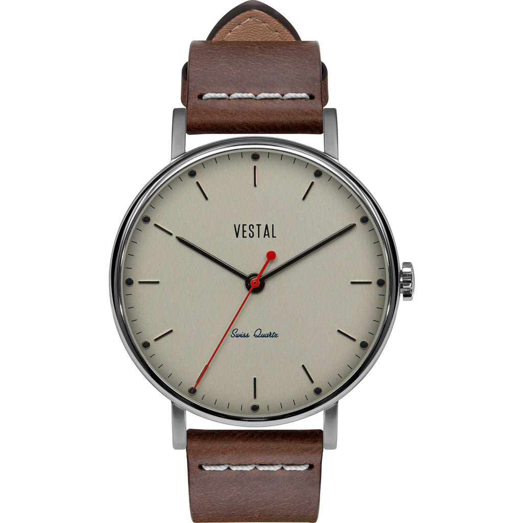 There is something to be said about a reliable timepiece that is equipped with quality materials and high character. The Sophisticate Italian Leather Watch from Vestal’s watch lineup is the best choice. Not only are their timepieces consistently reliable and precise, but Vestal's excellence and resilience is what separates them from other watch companies. Vestal watches are great accessories for any special occasion. The Sophisticate is furnished with a Light Brown Italian leather strap that harmonizes beautifully with the silver case and metallic white dial. Some traditional features include a stainless-steel case with an extra thick raised crystal and screw-down logo plate. The sleek design of the Sophisticate Series watches makes them the best option to wear at work or during play, perfect for everyday wear.