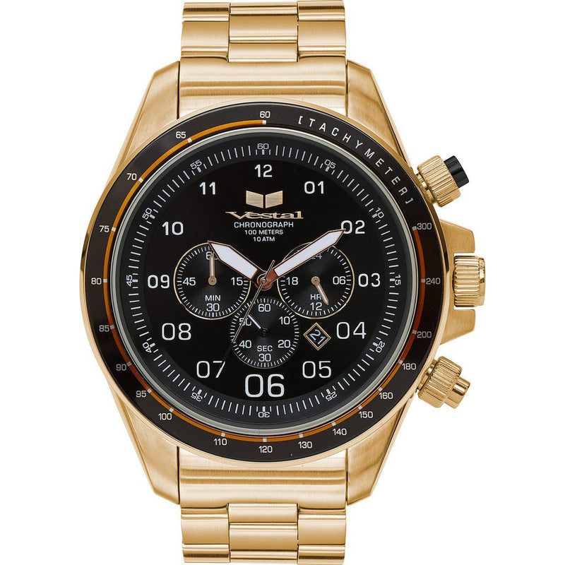 The ZR-3 is the largest yet in the Vestal collection. This vintage-inspired timepiece is an oversized premium round chronograph with stainless steel case construction and features an extra thick crystal face enclosed in an angular fixed bezel. All of these premium features are pulled together with a retro-style 3-link bracelet strap for a sleek and refined finish.