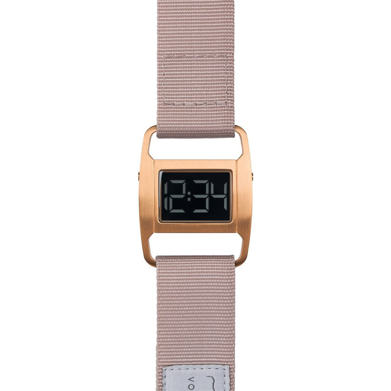 Designed by Michael Young, VOID's PXR-5 Brushed Copper Watch was originally launched in 2005, but its popularity has earned it a permanent spot in their collection. The shape of its stainless steel case enclosing a digital LCD display makes it a future classic. Strap it on with the woven nylon utility strap in dusty pink.