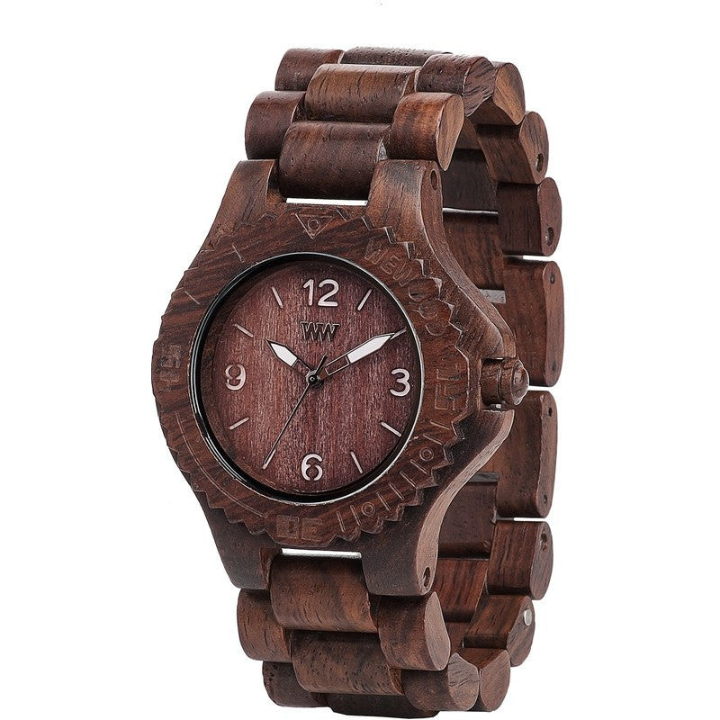 The Kale Watch from WeWood features brightly contrasting colors exemplifying the balance of modern design and Mother Nature. The Kale Choco-White is made from Indian Rosewood, a very strong and heavy wood that takes an excellent polish, and is a suitable wood for the black pieces in chess sets and billiard cues. Often streaked with hues of purple and red, each piece has its own unique color. Show off your love of natural materials with the Kale watch that will rest comfortably on your wrist while making a bold statement.